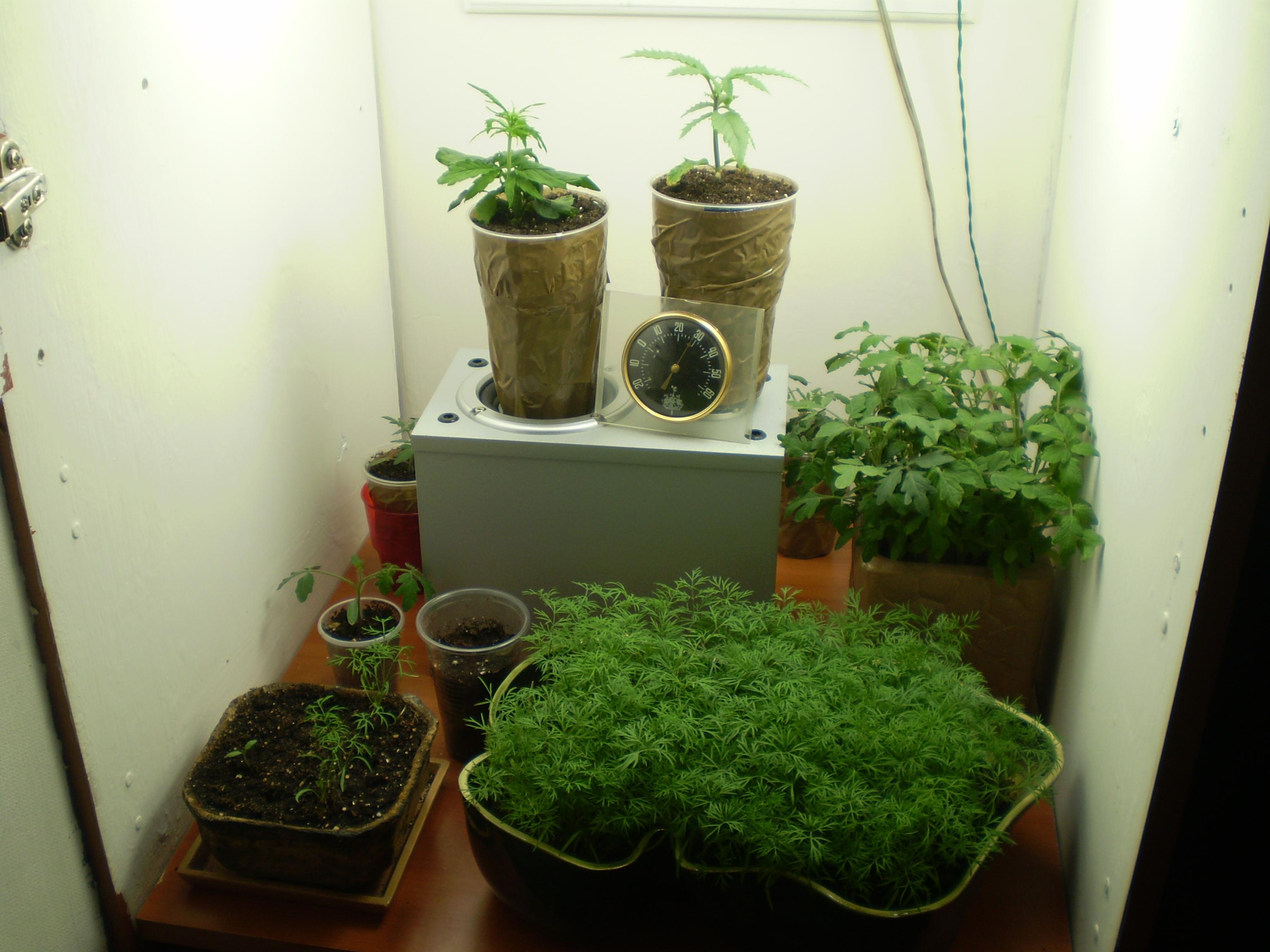 глеб4ик Опубликовано 5 октября, 2008 Жалоба Поделиться Опубликовано 5 октября, 2008 Раз появился такой раздел,пожалуй,начну. Ещё может кто и поможет . Шкаф: высота:74см глубина:40см Ширина:52см Растения: 1 На вдув,1 на выдув у ламп. 1. Укроп "Кибрай" http://growclub.life/uploads/1222295648/gal...0_219_59679.jpg 2. Укроп " Салют" (фото позже) 3. Томат 2 сорта,1 сорта названия не помню, но другой точно называется "Бусинка" (плоды 3-5 гр :sarcastic_hand:). общий вид http://growclub.life/uploads/1222295648/gal..._219_990499.jpg Растут с 16.09,тоесть 19 дней,удобряю Унифлор рост 100%, чередуя с обычным поливом через 2 раза. Помидоры надо срочно рассаживать, их 20 штук в одном горшке. Остальные рассадил. Новые фото позже,эти были сняты 27.09. ?????: В каких условиях должен расти томат в шкафу? Какая влажость,темпиратура,у меня днём 26-28,ночью опускается до 21-22.Если открываю окно на ночь то на 1-2 градуса ниже. Ставлю стакан с водой в шкаф,т.к батареи в квартире включины.Скоро по мерюю влажность как только привезу из другой квартиры приборы. Ещё померюю световой поток,ради интереса. Надеюсь,на салат хватит. Цитата Ссылка на комментарий Поделиться на другие сайты Поделиться
