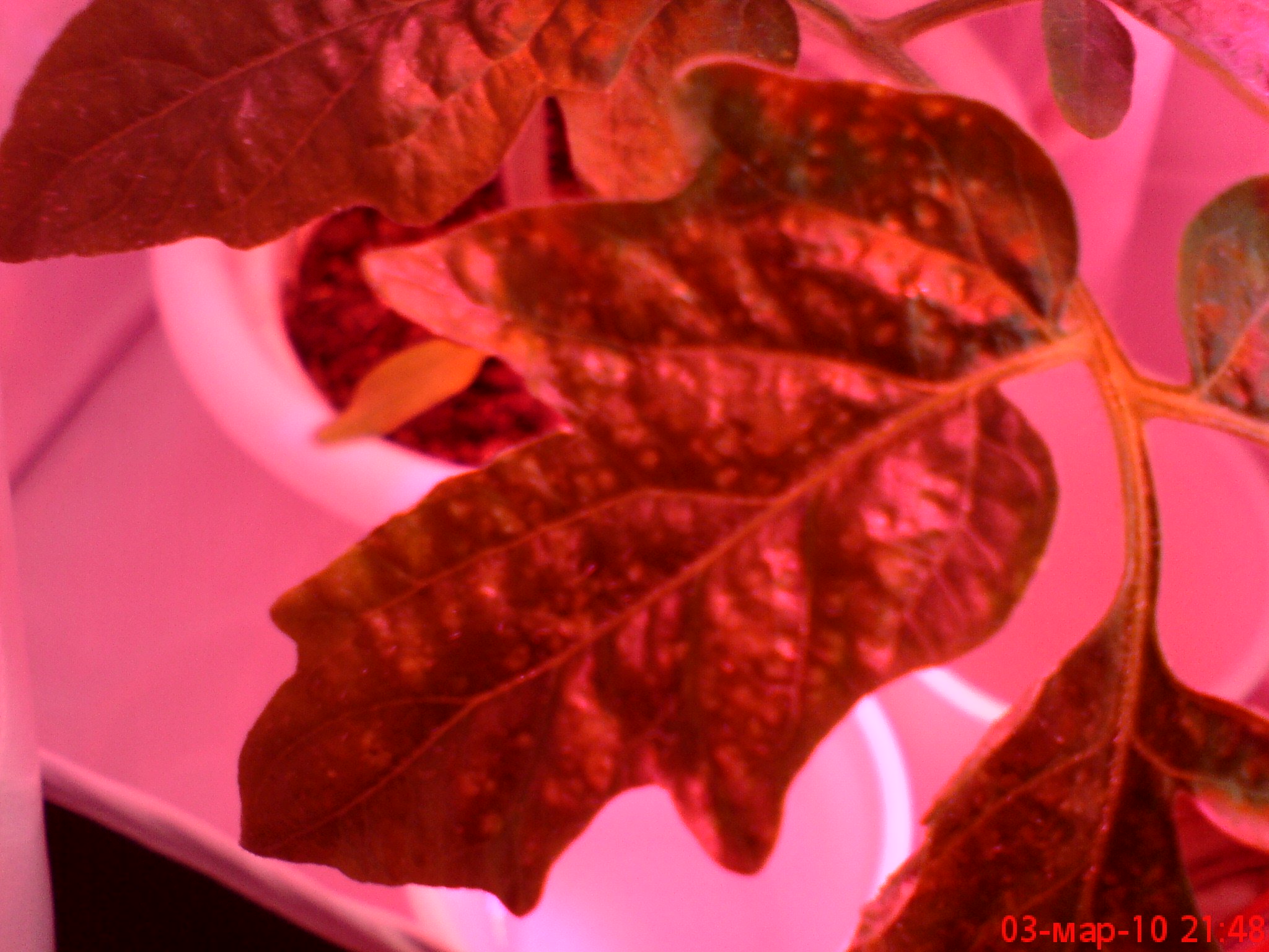 .:m@d:. Опубликовано 3 марта, 2010 Автор Жалоба Поделиться Опубликовано 3 марта, 2010 (изменено) Теперь по поводу помидорок. На одном из 4 кустиков были замечены некоторые траблы которые немного подпортили моё настроение... Описание дефекта: с наружней стороны на одной из веток одного из кустов видны желтые мелкие пятнышки на листиках, а с обратной стороны вообще не понятно что, толи волдыри толи ещё чего... фото вам больше раскажет я думаю, поэтому фантазировать тут не стоит. полив также как и у перцев без удоб но с магнием. Всё же надеюсь что есть знающие люди которые заглядывают в этот не очень посещаемый раздел))) по выращиванию культурных растений, и помогут решить все траблы. Изменено 3 марта, 2010 пользователем .:m@d:. Цитата Ссылка на комментарий Поделиться на другие сайты Поделиться