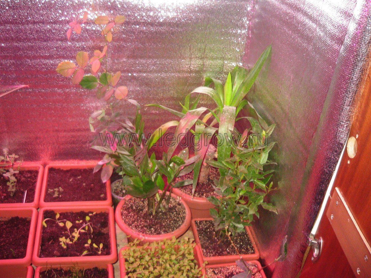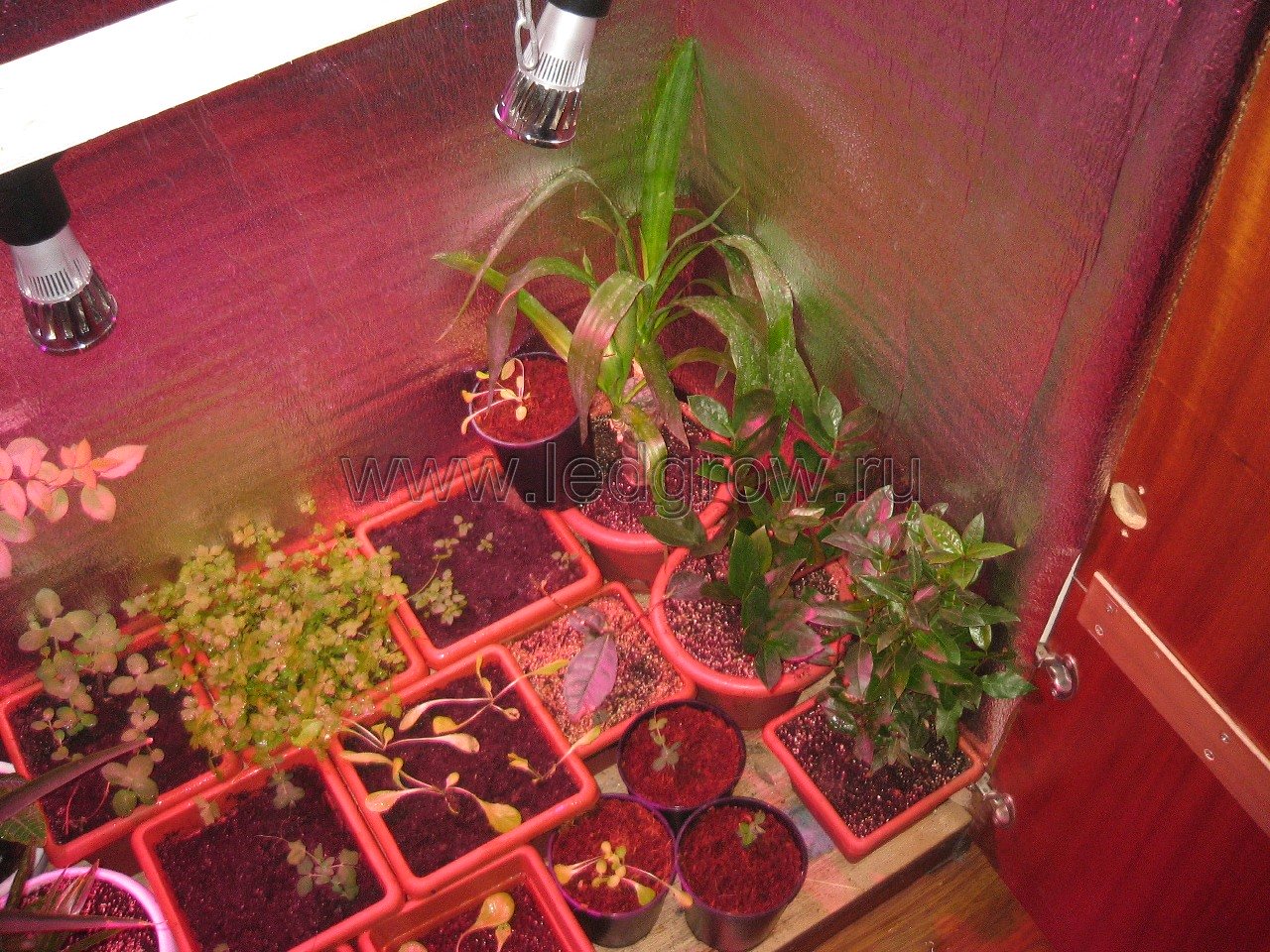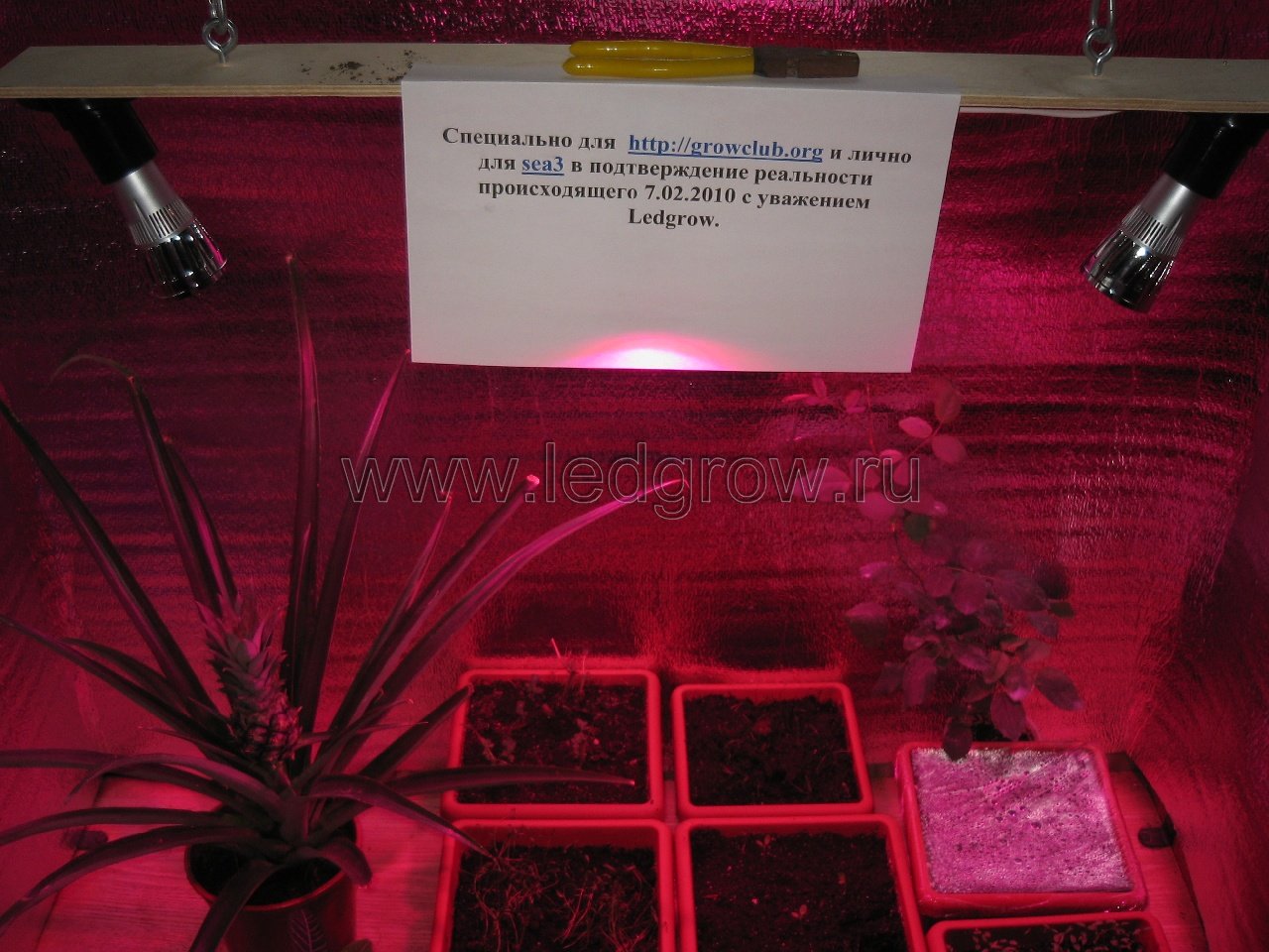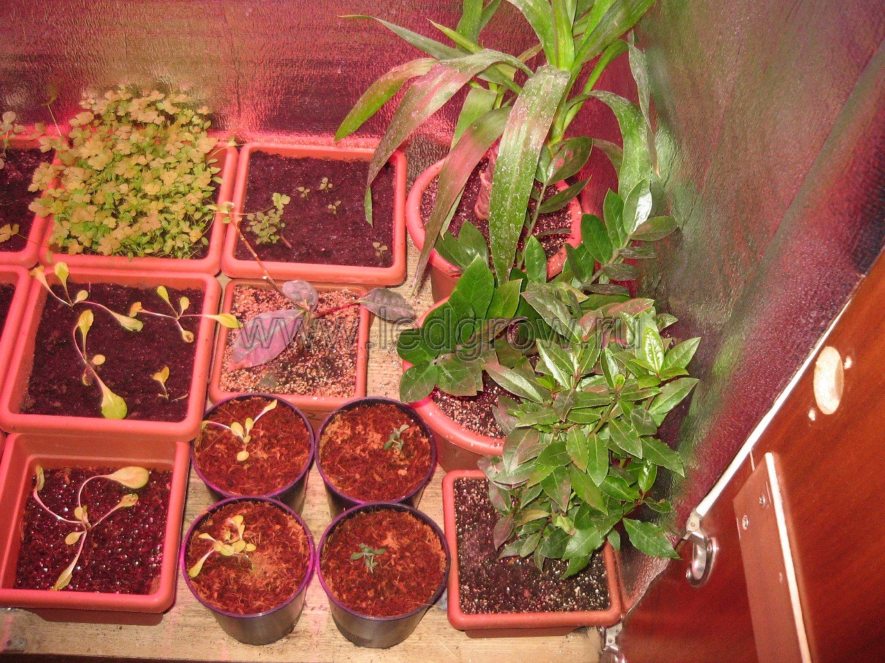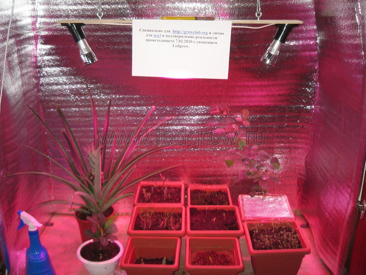 Ledgrow Опубликовано 14 марта, 2010 Жалоба Поделиться Опубликовано 14 марта, 2010 Всех приветствую в моем втором репорте посвященном светодиодам, пожалуйста отметьте для себя заранее, я ничего не продаю и ничего не навязываю мы не страдаем от недостатка клиентов, я просто показываю потенциальные возможности использования светодиодов в домашних условиях и по возможности отвечаю на возникающие вопросы, где вы будете их покупать и будете ли покупать вообще мне все равно, поэтому очень Вас прошу удержаться от нападок в мою сторону по этой теме и прежде чем что то критиковать сделайте лучше меня или хотя бы так же, заранее благодарю за понимание :) Предмет исследования. Особенности GrowSprout. Низкое энергопотребление — лампочка использует только 15 Вт. Минимальная рабочая температура — растения не пострадают даже при полном контакте с лампой. Универсальность — тип цоколя Е-27. Срок службы до 100.000 часов. Безвредный для Вас и окружающей среды. Применение GrowSprout: Дополнительное или основное освещение рассады и клонов. Основное освещение области 15×15 см. Дополнительное освещение растений совместнос металлогалойдной или натриевой лампой для увеличенияурожайности и скрости роста. Характеристики. • Освещаемая площадь до 4 кв. метров* • Тип цоколя Е-27. • Срок службы до 100.000 часов*. • Номинальное напряжение: 220-240V 50Hz. • Макс. мощность: 15W. • Световая мощность: 2250Лм. • Источник света: LED мощностью 1 Вт • Цвет: Красный & Синий (7:2) • Длина волны: Красный - 660 нм, Синий цвет - 450 нм • Рабочая температура: -20°c ~ +50°c • Угол освещения: 120 ° • Размер: 17.5×6 см • Вес: 0,25 кг *данные производителя. Условия выращивания: Шкаф платяной обыкновенный, отражающее покрытие пленэкс, дополнительная вентиляция отсутствует (естественный приток из щелей) Высота - 150 Ширина - 110 Глубина - 60 Площадь - 0.66м2 Задачи:Определить достаточно ли 45 Вт. для освещения площади в 0.66м2 и полноценного существования и развития светолюбивых растений. Цели: Обеспечить себя свежей зеленью, удовлетворить потребности светолюбивых растений в достаточном освещении в осенне-зимний период, реанимировать измученные или больные растения в случае необходимости. Цитата Ссылка на комментарий Поделиться на другие сайты Поделиться