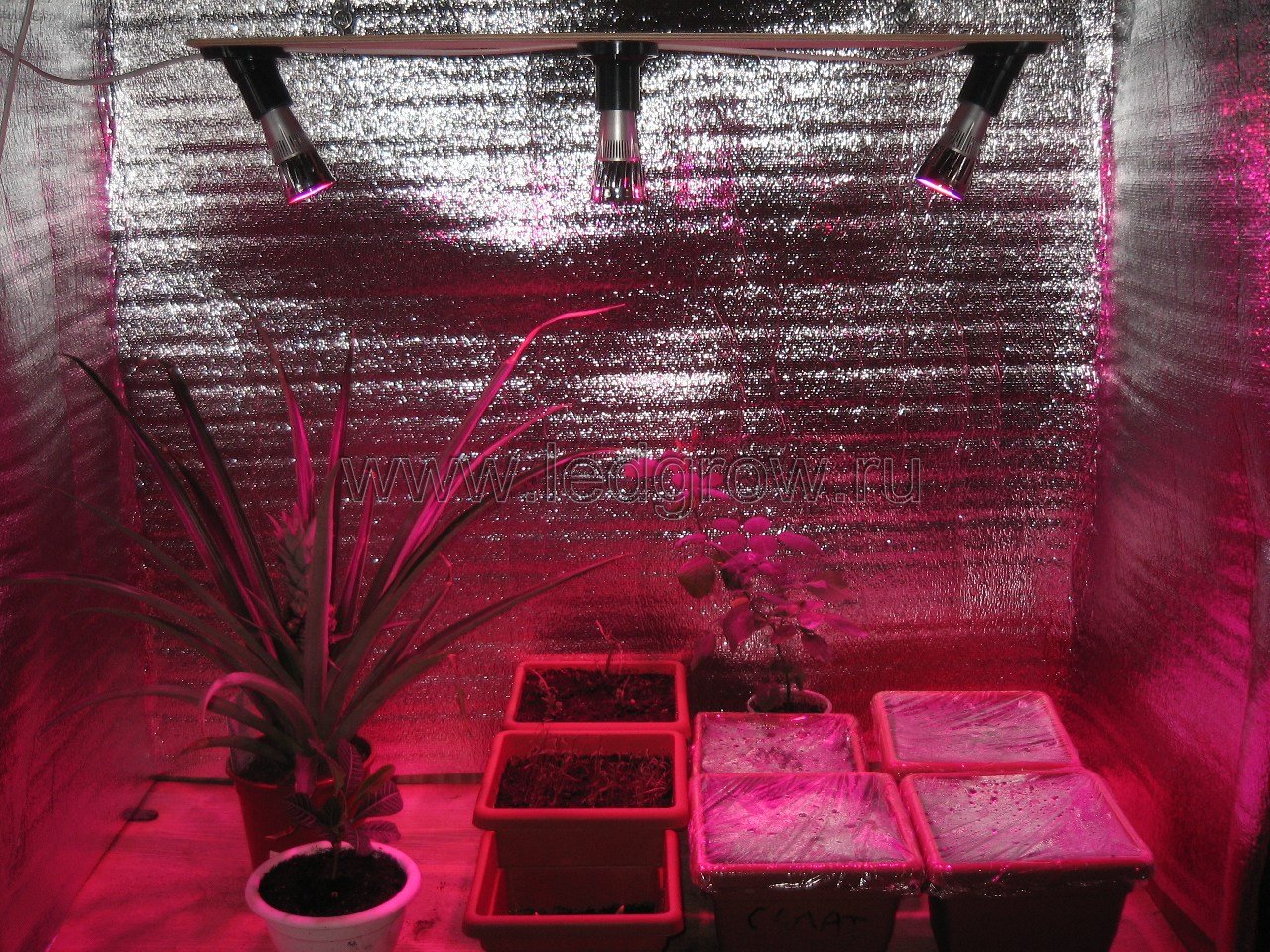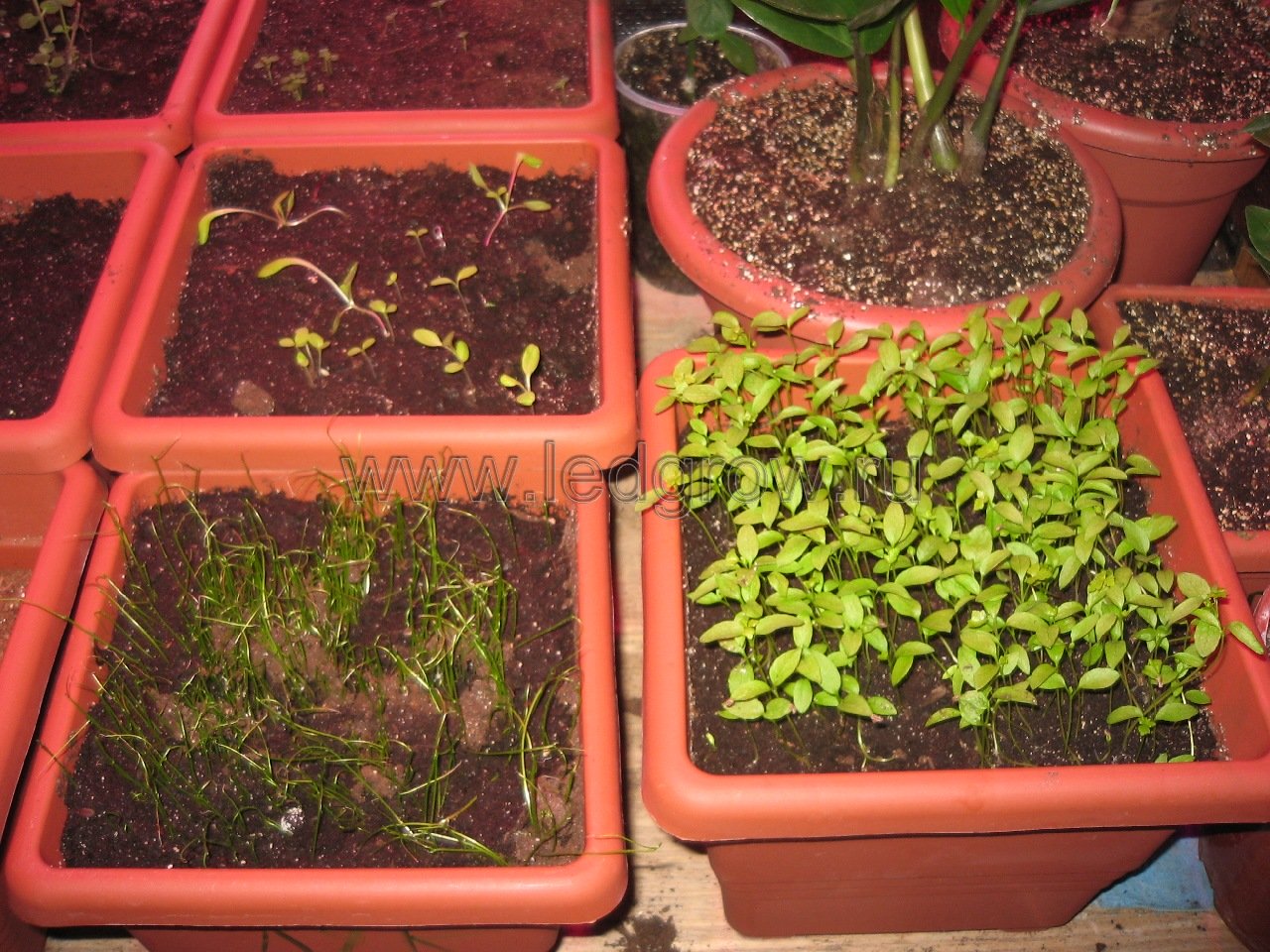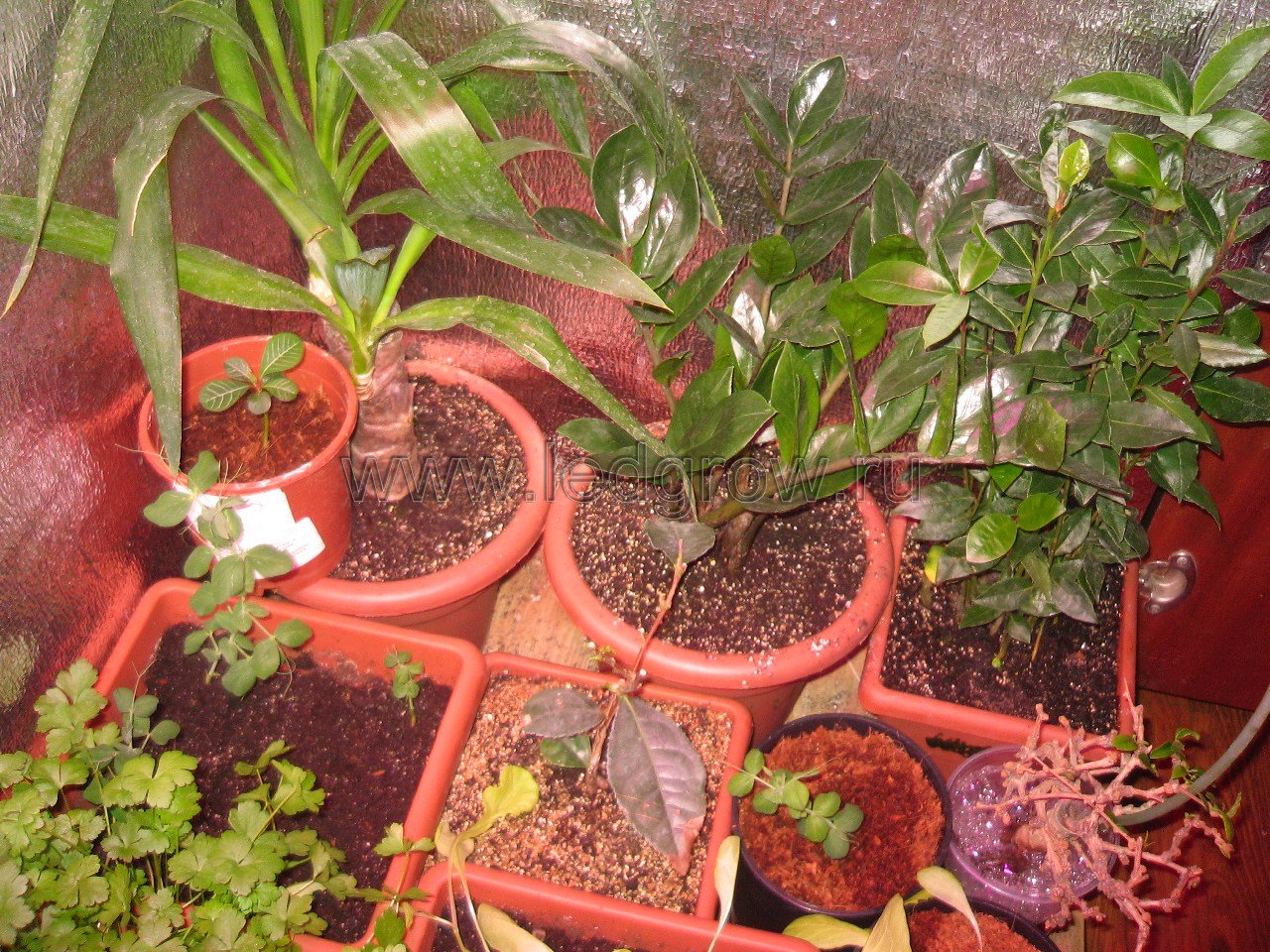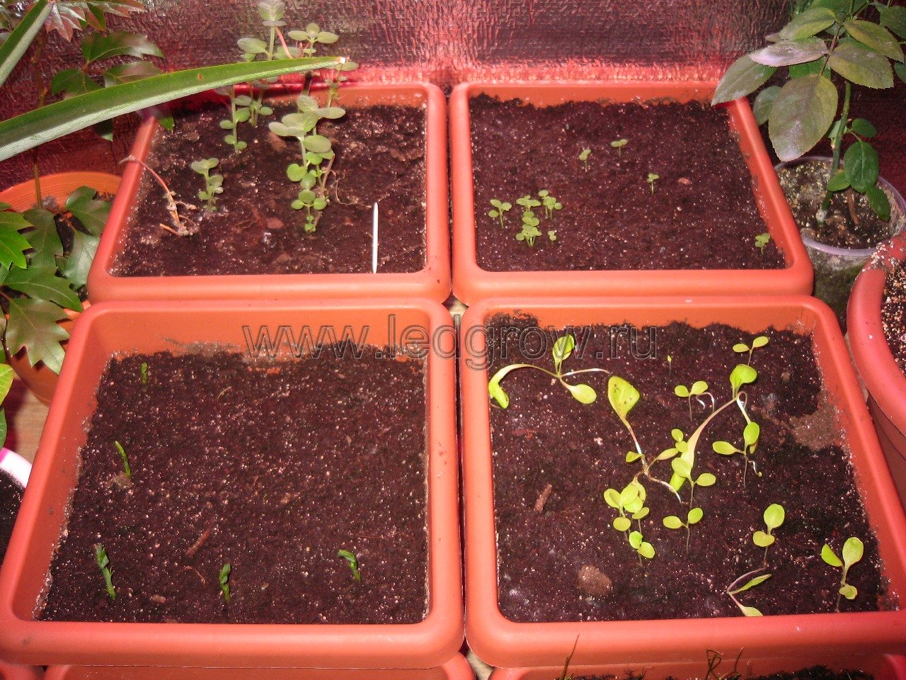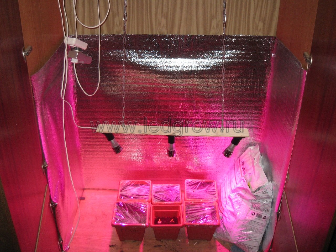 Ledgrow Опубликовано 14 марта, 2010 Жалоба Поделиться Опубликовано 14 марта, 2010 Всех приветствую в моем втором репорте посвященном светодиодам, пожалуйста отметьте для себя заранее, я ничего не продаю и ничего не навязываю мы не страдаем от недостатка клиентов, я просто показываю потенциальные возможности использования светодиодов в домашних условиях и по возможности отвечаю на возникающие вопросы, где вы будете их покупать и будете ли покупать вообще мне все равно, поэтому очень Вас прошу удержаться от нападок в мою сторону по этой теме и прежде чем что то критиковать сделайте лучше меня или хотя бы так же, заранее благодарю за понимание :) Предмет исследования. Особенности GrowSprout. Низкое энергопотребление — лампочка использует только 15 Вт. Минимальная рабочая температура — растения не пострадают даже при полном контакте с лампой. Универсальность — тип цоколя Е-27. Срок службы до 100.000 часов. Безвредный для Вас и окружающей среды. Применение GrowSprout: Дополнительное или основное освещение рассады и клонов. Основное освещение области 15×15 см. Дополнительное освещение растений совместнос металлогалойдной или натриевой лампой для увеличенияурожайности и скрости роста. Характеристики. • Освещаемая площадь до 4 кв. метров* • Тип цоколя Е-27. • Срок службы до 100.000 часов*. • Номинальное напряжение: 220-240V 50Hz. • Макс. мощность: 15W. • Световая мощность: 2250Лм. • Источник света: LED мощностью 1 Вт • Цвет: Красный & Синий (7:2) • Длина волны: Красный - 660 нм, Синий цвет - 450 нм • Рабочая температура: -20°c ~ +50°c • Угол освещения: 120 ° • Размер: 17.5×6 см • Вес: 0,25 кг *данные производителя. Условия выращивания: Шкаф платяной обыкновенный, отражающее покрытие пленэкс, дополнительная вентиляция отсутствует (естественный приток из щелей) Высота - 150 Ширина - 110 Глубина - 60 Площадь - 0.66м2 Задачи:Определить достаточно ли 45 Вт. для освещения площади в 0.66м2 и полноценного существования и развития светолюбивых растений. Цели: Обеспечить себя свежей зеленью, удовлетворить потребности светолюбивых растений в достаточном освещении в осенне-зимний период, реанимировать измученные или больные растения в случае необходимости. Цитата Ссылка на комментарий Поделиться на другие сайты Поделиться