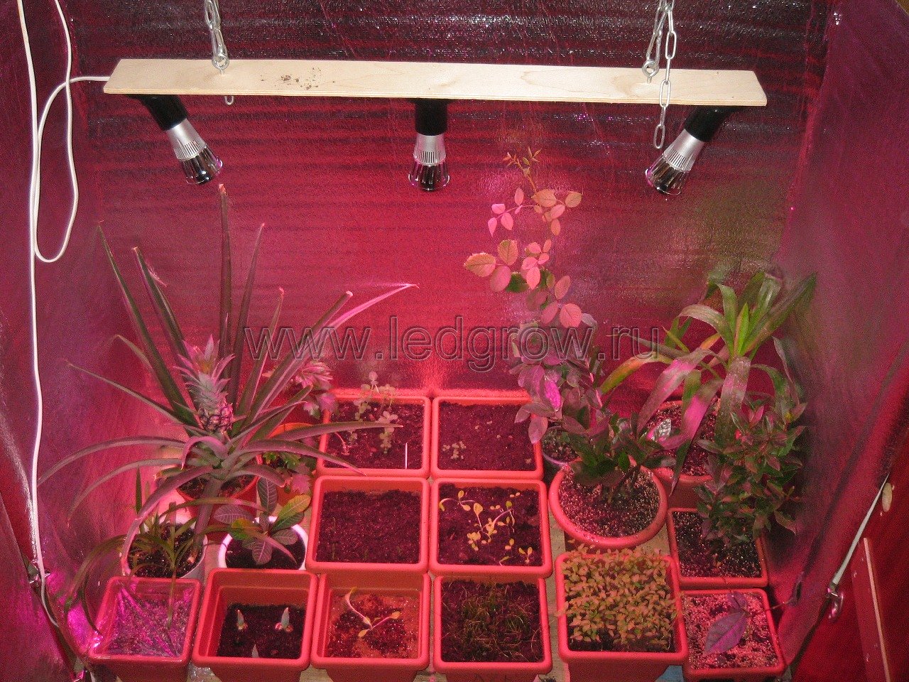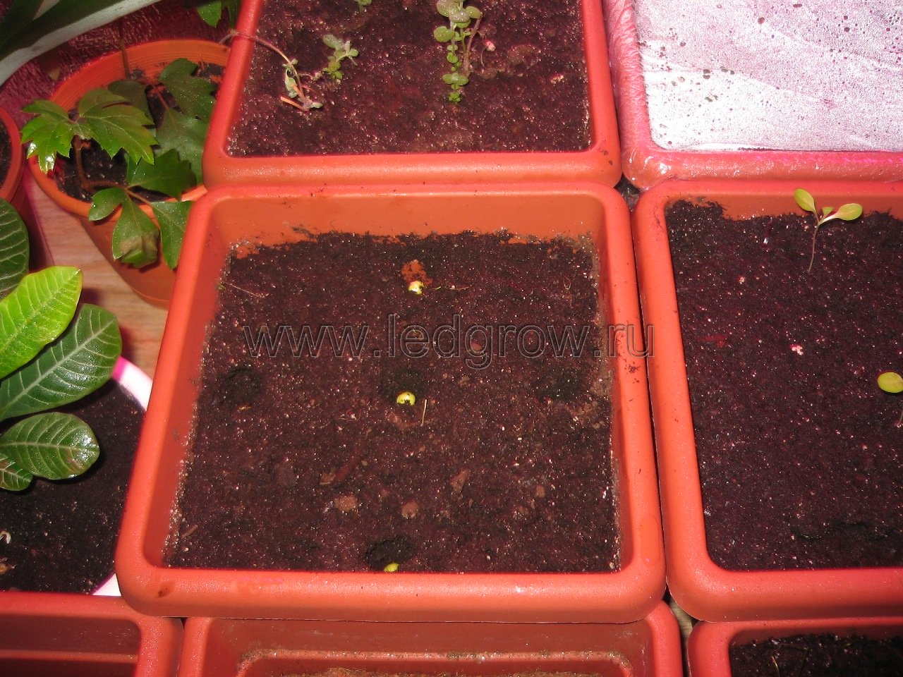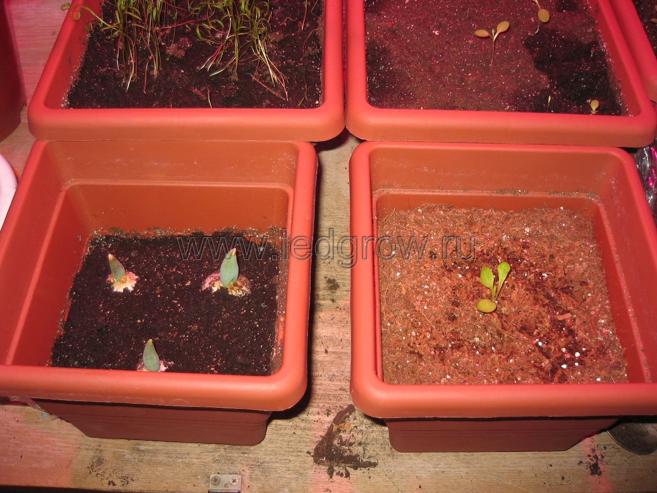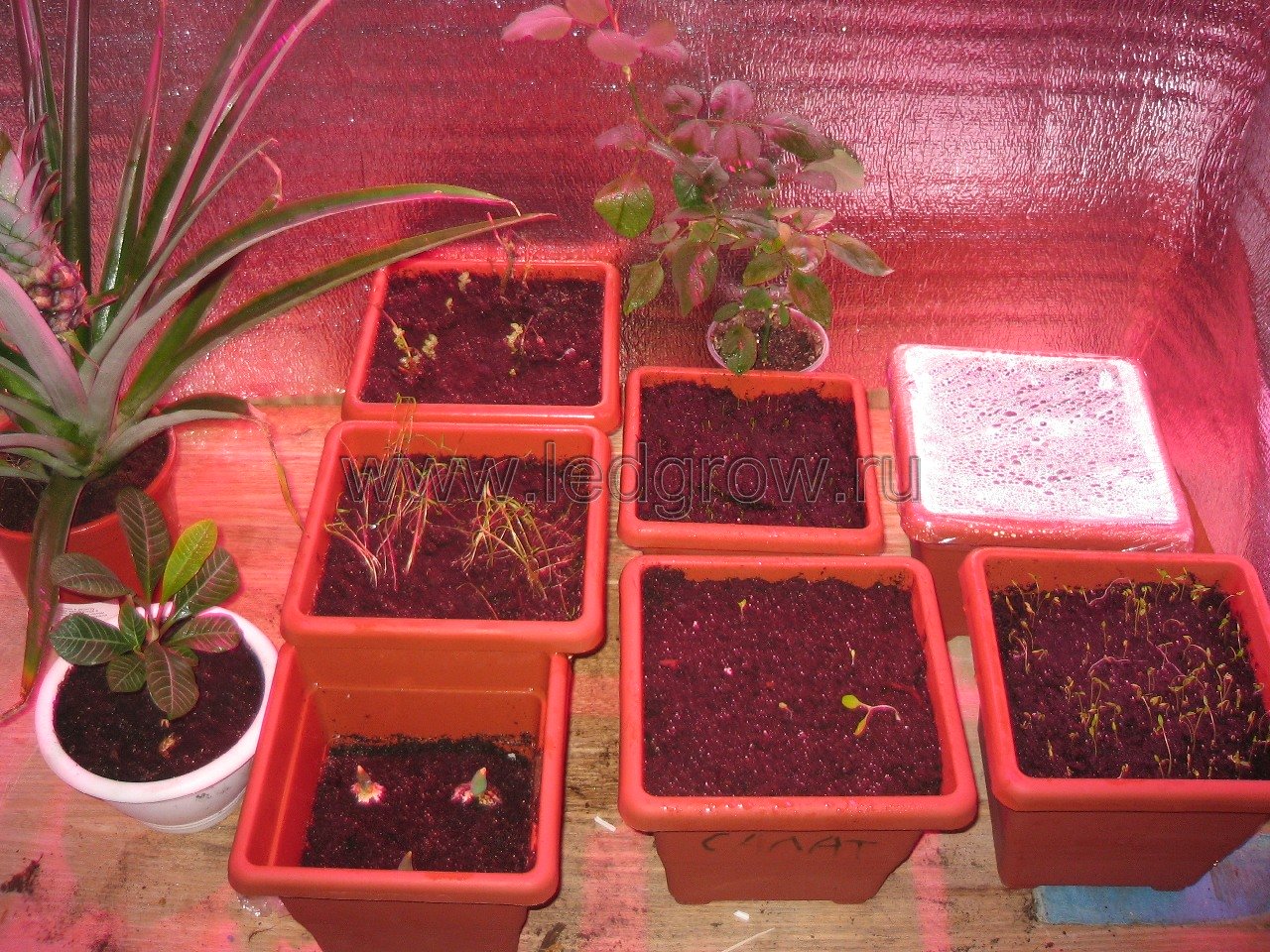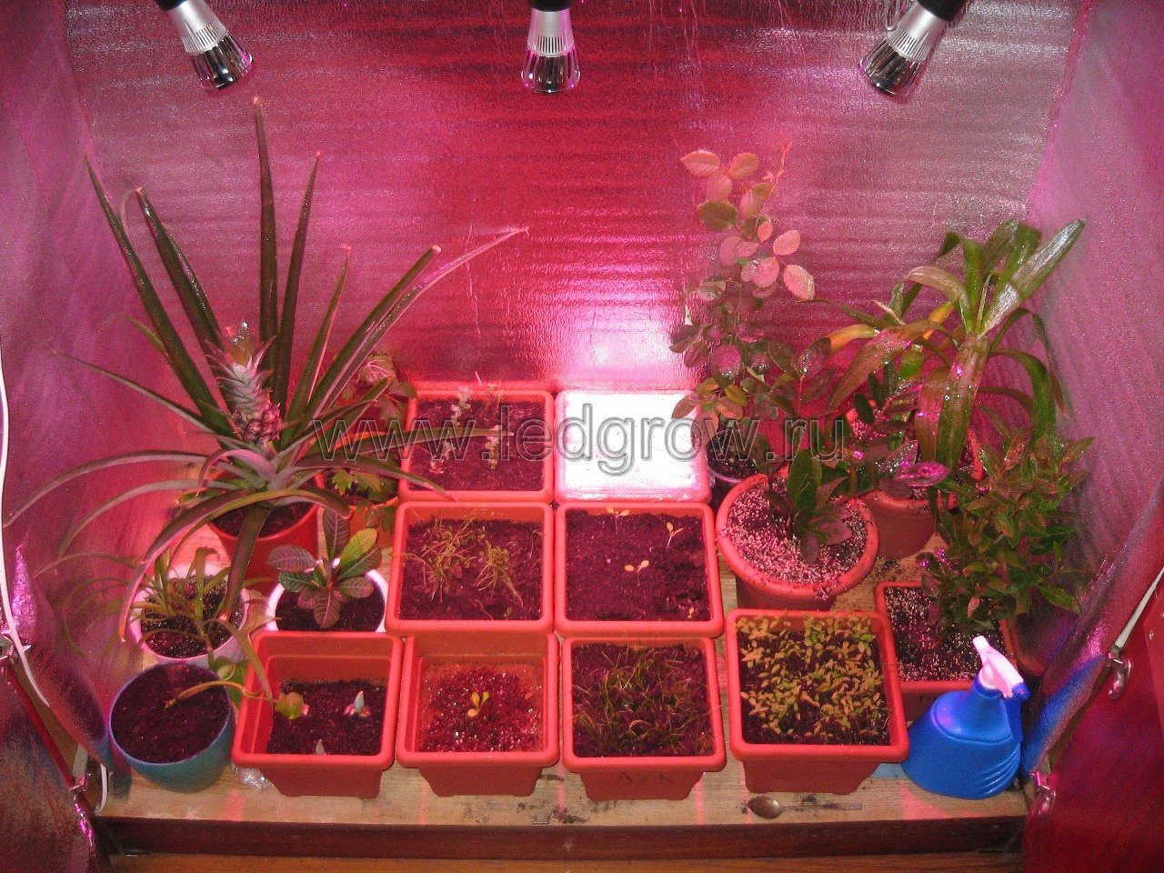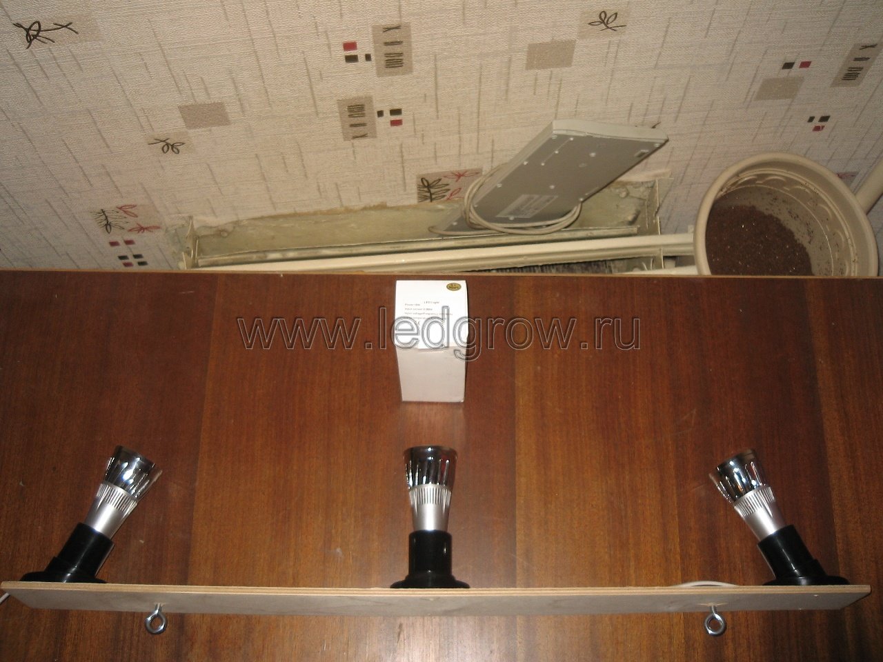 Ledgrow Опубликовано 14 марта, 2010 Жалоба Поделиться Опубликовано 14 марта, 2010 Всех приветствую в моем втором репорте посвященном светодиодам, пожалуйста отметьте для себя заранее, я ничего не продаю и ничего не навязываю мы не страдаем от недостатка клиентов, я просто показываю потенциальные возможности использования светодиодов в домашних условиях и по возможности отвечаю на возникающие вопросы, где вы будете их покупать и будете ли покупать вообще мне все равно, поэтому очень Вас прошу удержаться от нападок в мою сторону по этой теме и прежде чем что то критиковать сделайте лучше меня или хотя бы так же, заранее благодарю за понимание :) Предмет исследования. Особенности GrowSprout. Низкое энергопотребление — лампочка использует только 15 Вт. Минимальная рабочая температура — растения не пострадают даже при полном контакте с лампой. Универсальность — тип цоколя Е-27. Срок службы до 100.000 часов. Безвредный для Вас и окружающей среды. Применение GrowSprout: Дополнительное или основное освещение рассады и клонов. Основное освещение области 15×15 см. Дополнительное освещение растений совместнос металлогалойдной или натриевой лампой для увеличенияурожайности и скрости роста. Характеристики. • Освещаемая площадь до 4 кв. метров* • Тип цоколя Е-27. • Срок службы до 100.000 часов*. • Номинальное напряжение: 220-240V 50Hz. • Макс. мощность: 15W. • Световая мощность: 2250Лм. • Источник света: LED мощностью 1 Вт • Цвет: Красный & Синий (7:2) • Длина волны: Красный - 660 нм, Синий цвет - 450 нм • Рабочая температура: -20°c ~ +50°c • Угол освещения: 120 ° • Размер: 17.5×6 см • Вес: 0,25 кг *данные производителя. Условия выращивания: Шкаф платяной обыкновенный, отражающее покрытие пленэкс, дополнительная вентиляция отсутствует (естественный приток из щелей) Высота - 150 Ширина - 110 Глубина - 60 Площадь - 0.66м2 Задачи:Определить достаточно ли 45 Вт. для освещения площади в 0.66м2 и полноценного существования и развития светолюбивых растений. Цели: Обеспечить себя свежей зеленью, удовлетворить потребности светолюбивых растений в достаточном освещении в осенне-зимний период, реанимировать измученные или больные растения в случае необходимости. Цитата Ссылка на комментарий Поделиться на другие сайты Поделиться