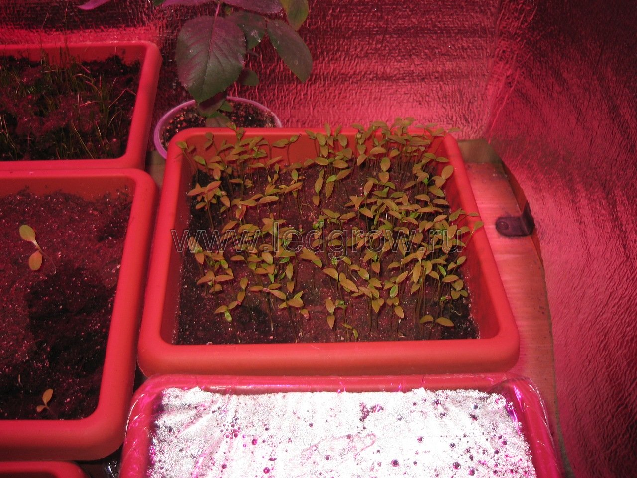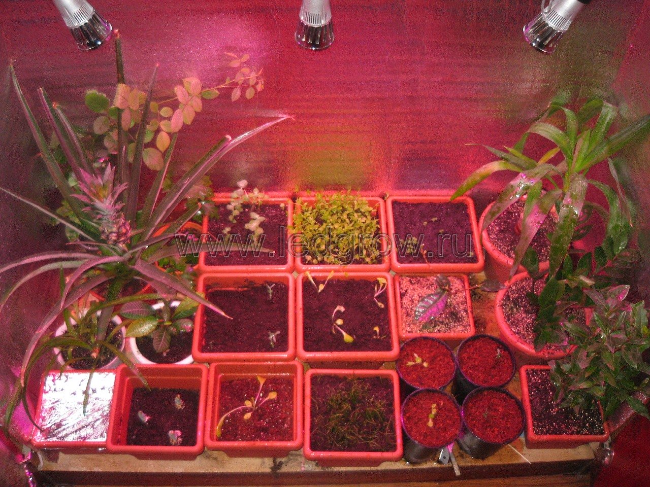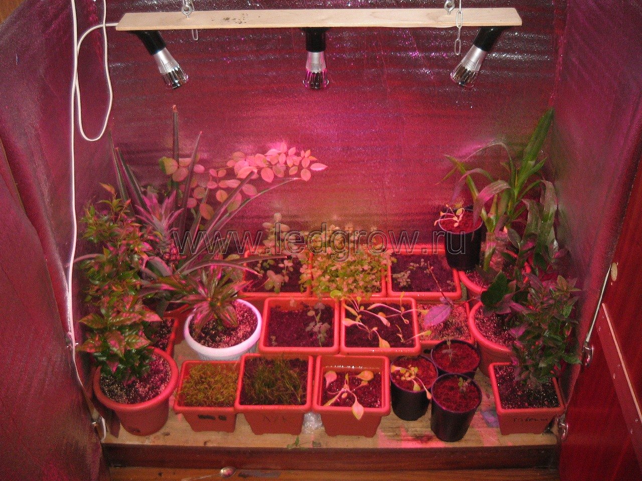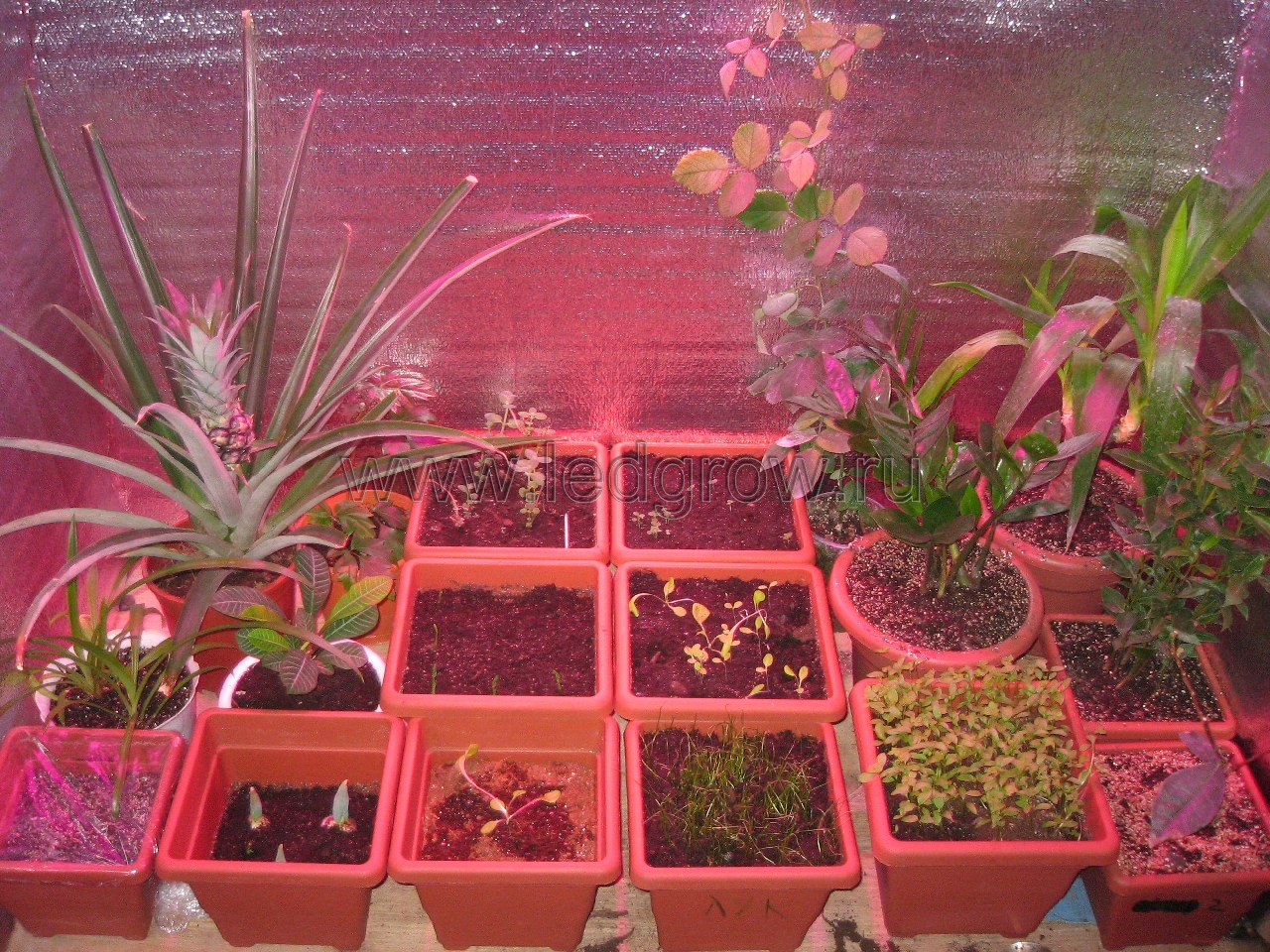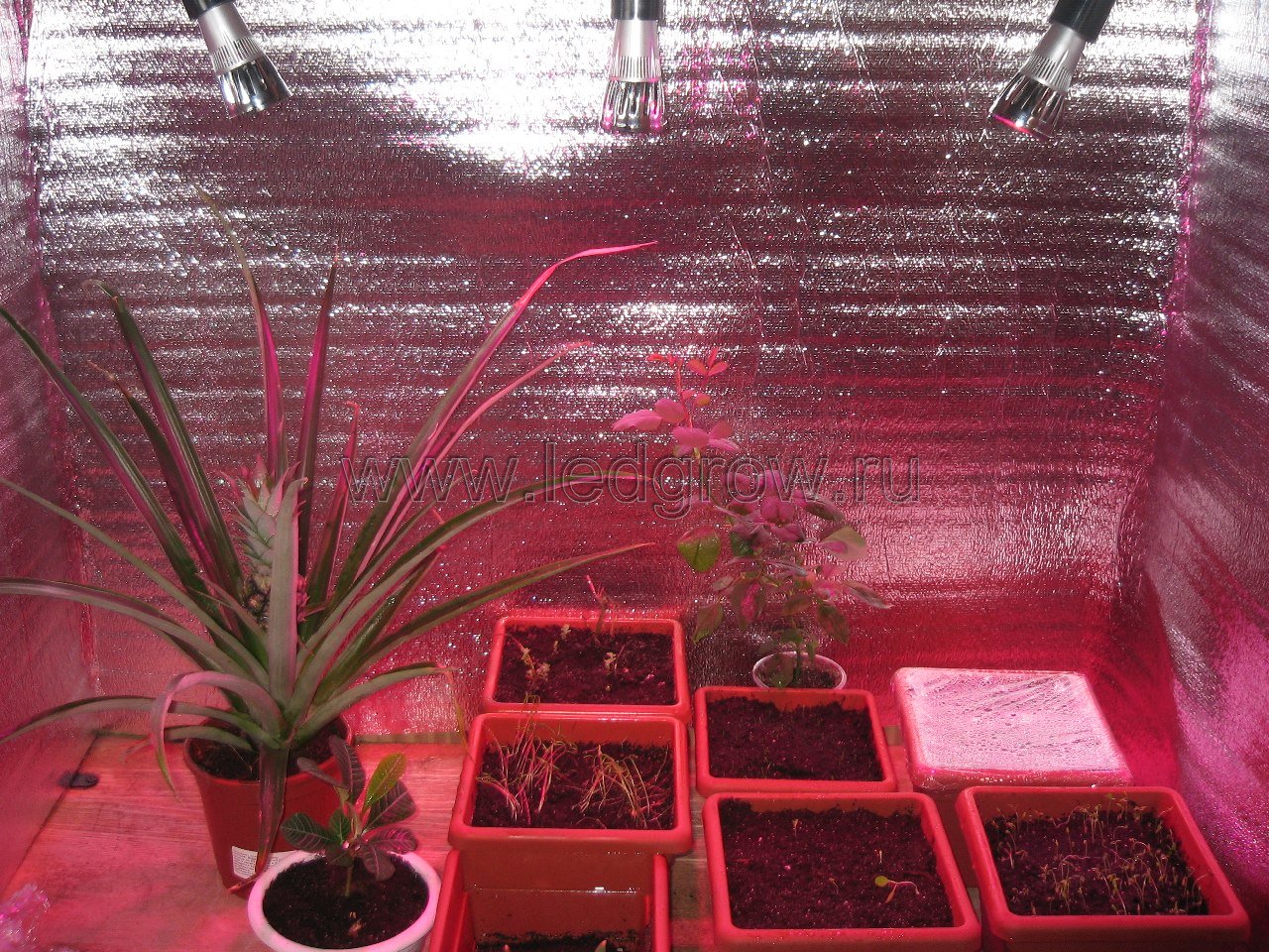 Ledgrow Опубликовано 14 марта, 2010 Жалоба Поделиться Опубликовано 14 марта, 2010 Всех приветствую в моем втором репорте посвященном светодиодам, пожалуйста отметьте для себя заранее, я ничего не продаю и ничего не навязываю мы не страдаем от недостатка клиентов, я просто показываю потенциальные возможности использования светодиодов в домашних условиях и по возможности отвечаю на возникающие вопросы, где вы будете их покупать и будете ли покупать вообще мне все равно, поэтому очень Вас прошу удержаться от нападок в мою сторону по этой теме и прежде чем что то критиковать сделайте лучше меня или хотя бы так же, заранее благодарю за понимание :) Предмет исследования. Особенности GrowSprout. Низкое энергопотребление — лампочка использует только 15 Вт. Минимальная рабочая температура — растения не пострадают даже при полном контакте с лампой. Универсальность — тип цоколя Е-27. Срок службы до 100.000 часов. Безвредный для Вас и окружающей среды. Применение GrowSprout: Дополнительное или основное освещение рассады и клонов. Основное освещение области 15×15 см. Дополнительное освещение растений совместнос металлогалойдной или натриевой лампой для увеличенияурожайности и скрости роста. Характеристики. • Освещаемая площадь до 4 кв. метров* • Тип цоколя Е-27. • Срок службы до 100.000 часов*. • Номинальное напряжение: 220-240V 50Hz. • Макс. мощность: 15W. • Световая мощность: 2250Лм. • Источник света: LED мощностью 1 Вт • Цвет: Красный & Синий (7:2) • Длина волны: Красный - 660 нм, Синий цвет - 450 нм • Рабочая температура: -20°c ~ +50°c • Угол освещения: 120 ° • Размер: 17.5×6 см • Вес: 0,25 кг *данные производителя. Условия выращивания: Шкаф платяной обыкновенный, отражающее покрытие пленэкс, дополнительная вентиляция отсутствует (естественный приток из щелей) Высота - 150 Ширина - 110 Глубина - 60 Площадь - 0.66м2 Задачи:Определить достаточно ли 45 Вт. для освещения площади в 0.66м2 и полноценного существования и развития светолюбивых растений. Цели: Обеспечить себя свежей зеленью, удовлетворить потребности светолюбивых растений в достаточном освещении в осенне-зимний период, реанимировать измученные или больные растения в случае необходимости. Цитата Ссылка на комментарий Поделиться на другие сайты Поделиться