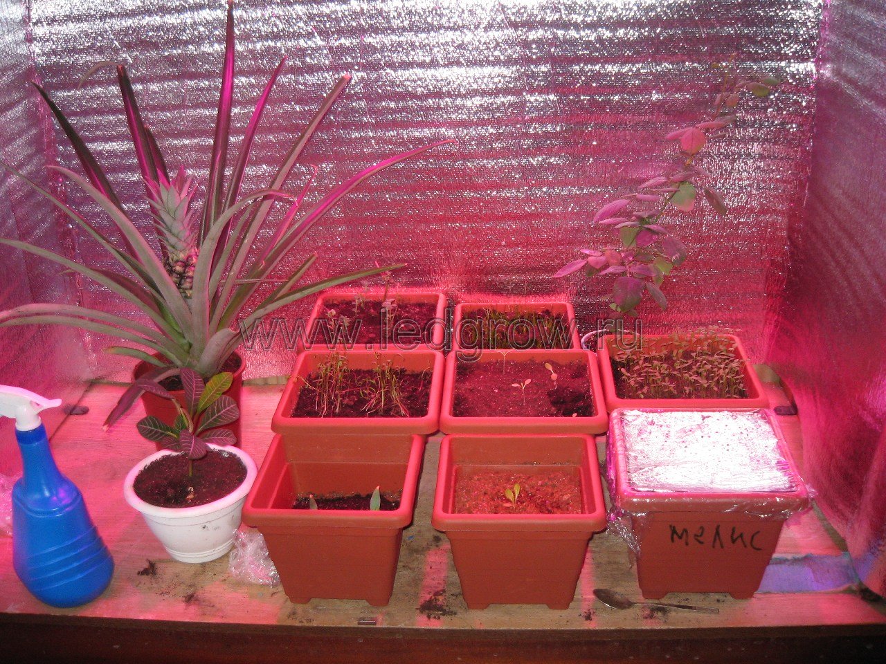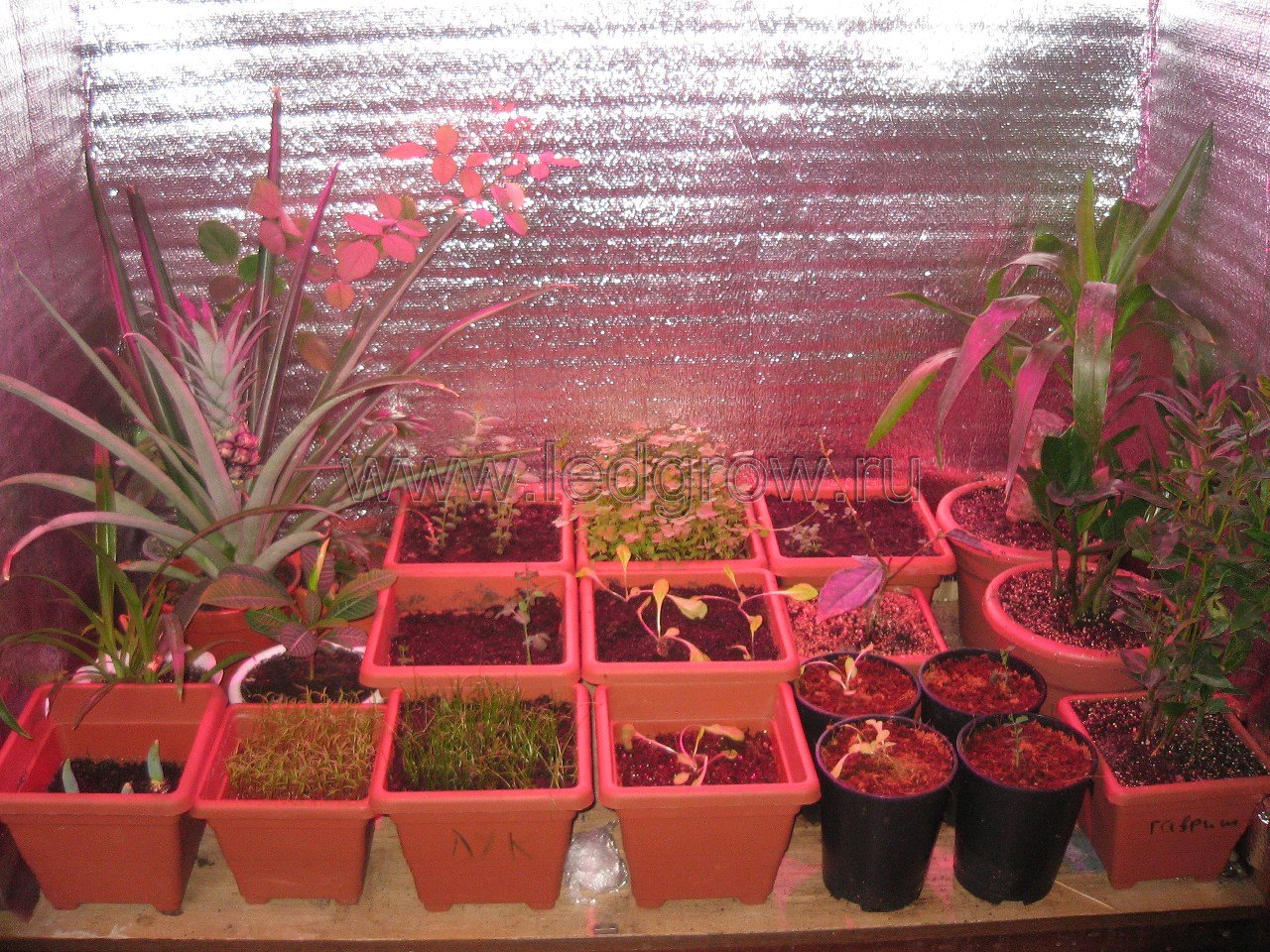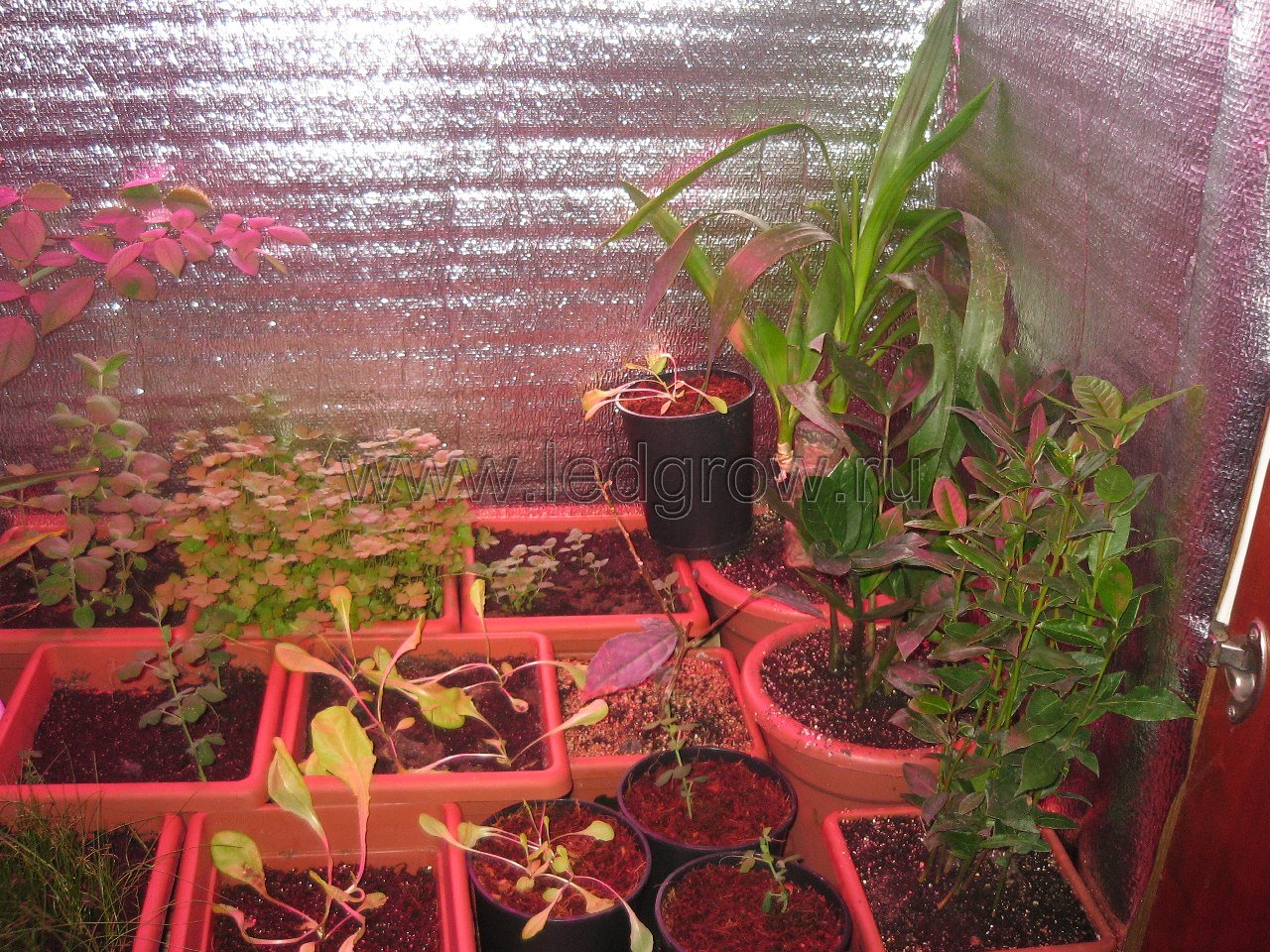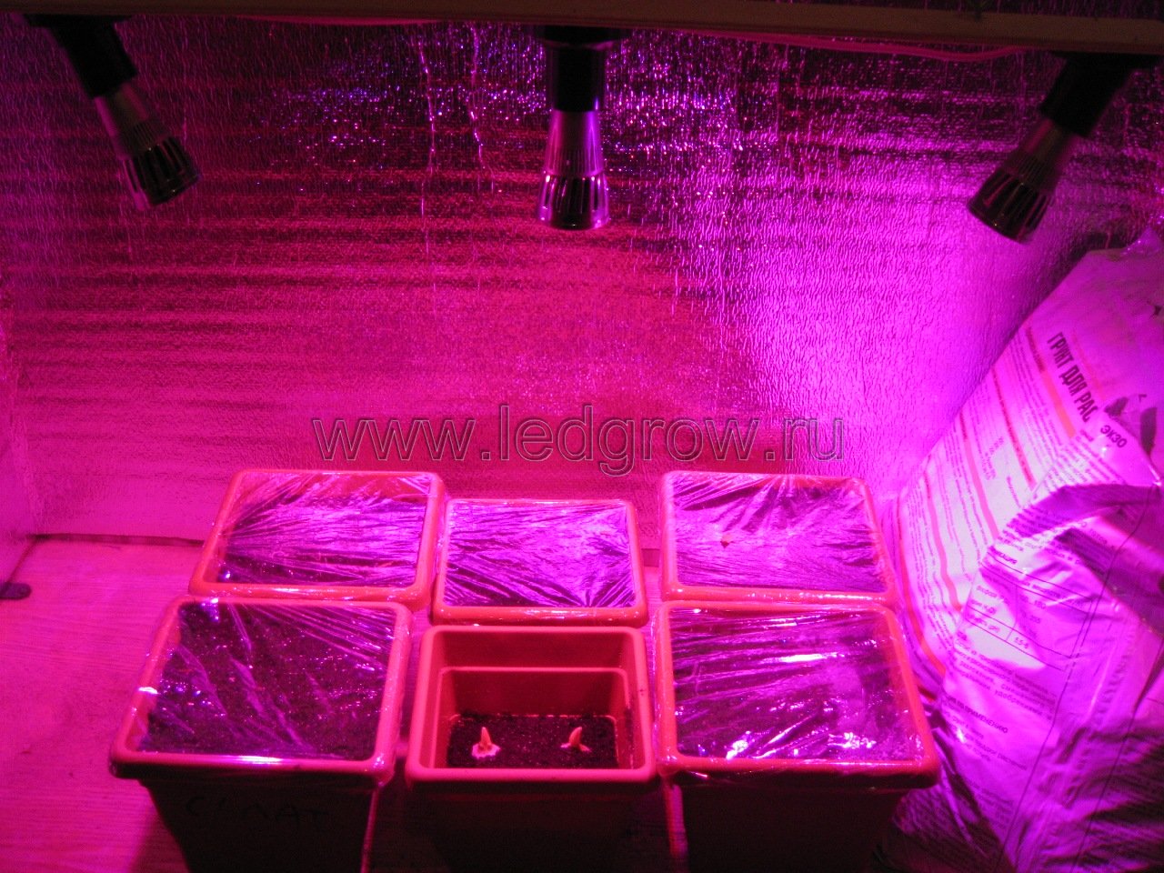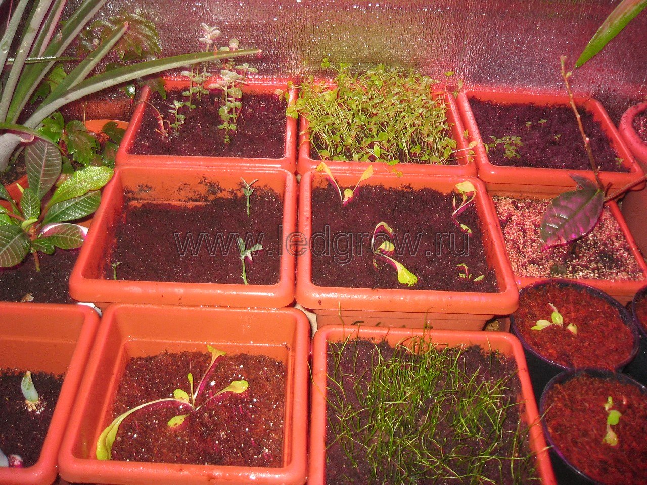 Ledgrow Опубликовано 14 марта, 2010 Жалоба Поделиться Опубликовано 14 марта, 2010 Всех приветствую в моем втором репорте посвященном светодиодам, пожалуйста отметьте для себя заранее, я ничего не продаю и ничего не навязываю мы не страдаем от недостатка клиентов, я просто показываю потенциальные возможности использования светодиодов в домашних условиях и по возможности отвечаю на возникающие вопросы, где вы будете их покупать и будете ли покупать вообще мне все равно, поэтому очень Вас прошу удержаться от нападок в мою сторону по этой теме и прежде чем что то критиковать сделайте лучше меня или хотя бы так же, заранее благодарю за понимание :) Предмет исследования. Особенности GrowSprout. Низкое энергопотребление — лампочка использует только 15 Вт. Минимальная рабочая температура — растения не пострадают даже при полном контакте с лампой. Универсальность — тип цоколя Е-27. Срок службы до 100.000 часов. Безвредный для Вас и окружающей среды. Применение GrowSprout: Дополнительное или основное освещение рассады и клонов. Основное освещение области 15×15 см. Дополнительное освещение растений совместнос металлогалойдной или натриевой лампой для увеличенияурожайности и скрости роста. Характеристики. • Освещаемая площадь до 4 кв. метров* • Тип цоколя Е-27. • Срок службы до 100.000 часов*. • Номинальное напряжение: 220-240V 50Hz. • Макс. мощность: 15W. • Световая мощность: 2250Лм. • Источник света: LED мощностью 1 Вт • Цвет: Красный & Синий (7:2) • Длина волны: Красный - 660 нм, Синий цвет - 450 нм • Рабочая температура: -20°c ~ +50°c • Угол освещения: 120 ° • Размер: 17.5×6 см • Вес: 0,25 кг *данные производителя. Условия выращивания: Шкаф платяной обыкновенный, отражающее покрытие пленэкс, дополнительная вентиляция отсутствует (естественный приток из щелей) Высота - 150 Ширина - 110 Глубина - 60 Площадь - 0.66м2 Задачи:Определить достаточно ли 45 Вт. для освещения площади в 0.66м2 и полноценного существования и развития светолюбивых растений. Цели: Обеспечить себя свежей зеленью, удовлетворить потребности светолюбивых растений в достаточном освещении в осенне-зимний период, реанимировать измученные или больные растения в случае необходимости. Цитата Ссылка на комментарий Поделиться на другие сайты Поделиться
