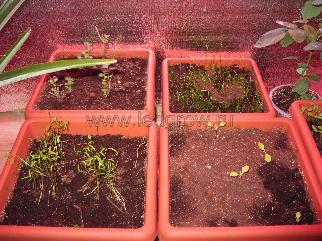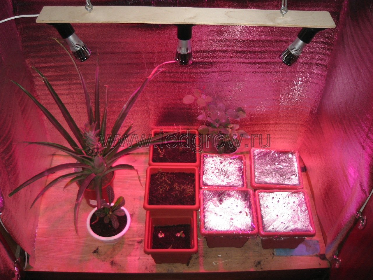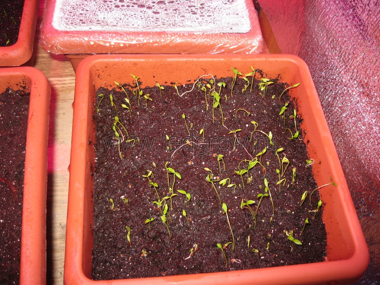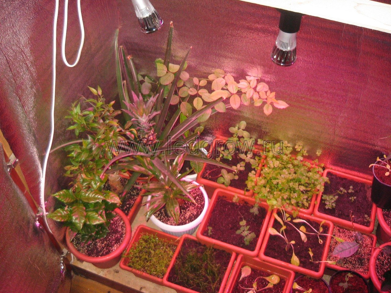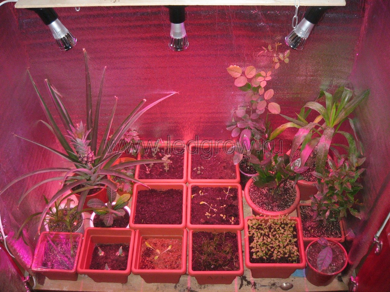 Ledgrow Опубликовано 14 марта, 2010 Жалоба Поделиться Опубликовано 14 марта, 2010 Всех приветствую в моем втором репорте посвященном светодиодам, пожалуйста отметьте для себя заранее, я ничего не продаю и ничего не навязываю мы не страдаем от недостатка клиентов, я просто показываю потенциальные возможности использования светодиодов в домашних условиях и по возможности отвечаю на возникающие вопросы, где вы будете их покупать и будете ли покупать вообще мне все равно, поэтому очень Вас прошу удержаться от нападок в мою сторону по этой теме и прежде чем что то критиковать сделайте лучше меня или хотя бы так же, заранее благодарю за понимание :) Предмет исследования. Особенности GrowSprout. Низкое энергопотребление — лампочка использует только 15 Вт. Минимальная рабочая температура — растения не пострадают даже при полном контакте с лампой. Универсальность — тип цоколя Е-27. Срок службы до 100.000 часов. Безвредный для Вас и окружающей среды. Применение GrowSprout: Дополнительное или основное освещение рассады и клонов. Основное освещение области 15×15 см. Дополнительное освещение растений совместнос металлогалойдной или натриевой лампой для увеличенияурожайности и скрости роста. Характеристики. • Освещаемая площадь до 4 кв. метров* • Тип цоколя Е-27. • Срок службы до 100.000 часов*. • Номинальное напряжение: 220-240V 50Hz. • Макс. мощность: 15W. • Световая мощность: 2250Лм. • Источник света: LED мощностью 1 Вт • Цвет: Красный & Синий (7:2) • Длина волны: Красный - 660 нм, Синий цвет - 450 нм • Рабочая температура: -20°c ~ +50°c • Угол освещения: 120 ° • Размер: 17.5×6 см • Вес: 0,25 кг *данные производителя. Условия выращивания: Шкаф платяной обыкновенный, отражающее покрытие пленэкс, дополнительная вентиляция отсутствует (естественный приток из щелей) Высота - 150 Ширина - 110 Глубина - 60 Площадь - 0.66м2 Задачи:Определить достаточно ли 45 Вт. для освещения площади в 0.66м2 и полноценного существования и развития светолюбивых растений. Цели: Обеспечить себя свежей зеленью, удовлетворить потребности светолюбивых растений в достаточном освещении в осенне-зимний период, реанимировать измученные или больные растения в случае необходимости. Цитата Ссылка на комментарий Поделиться на другие сайты Поделиться