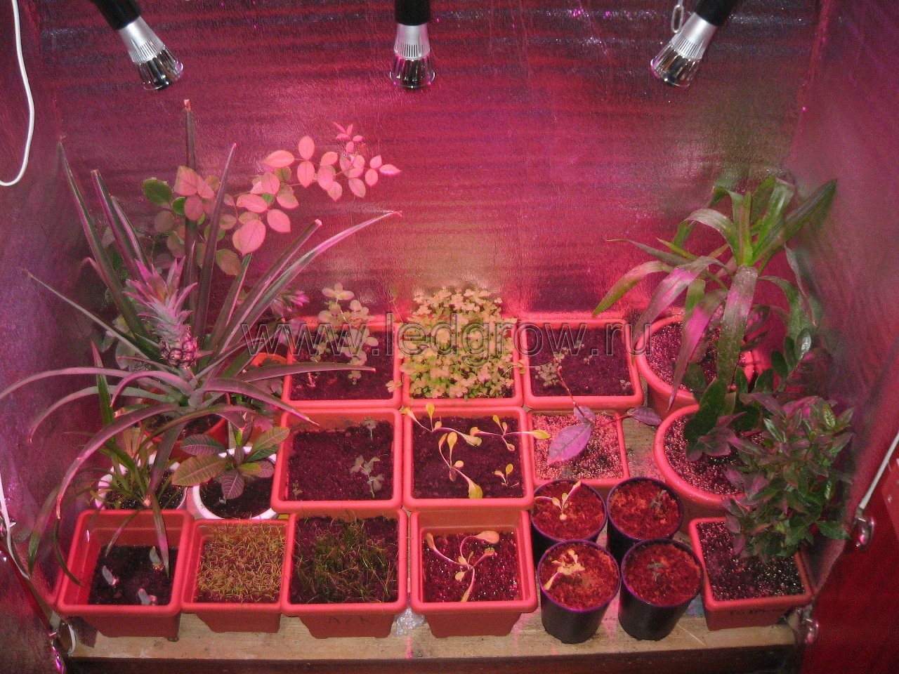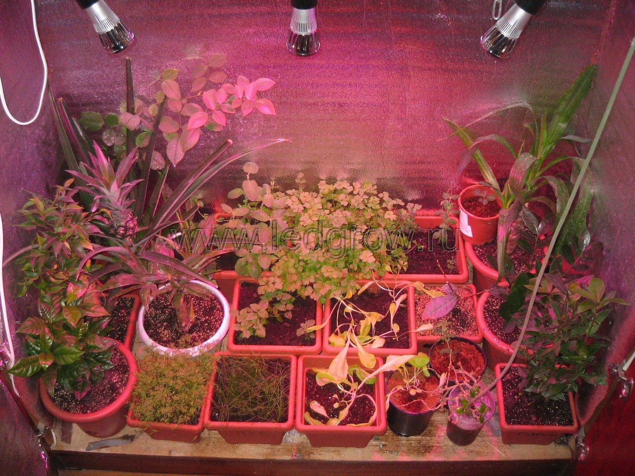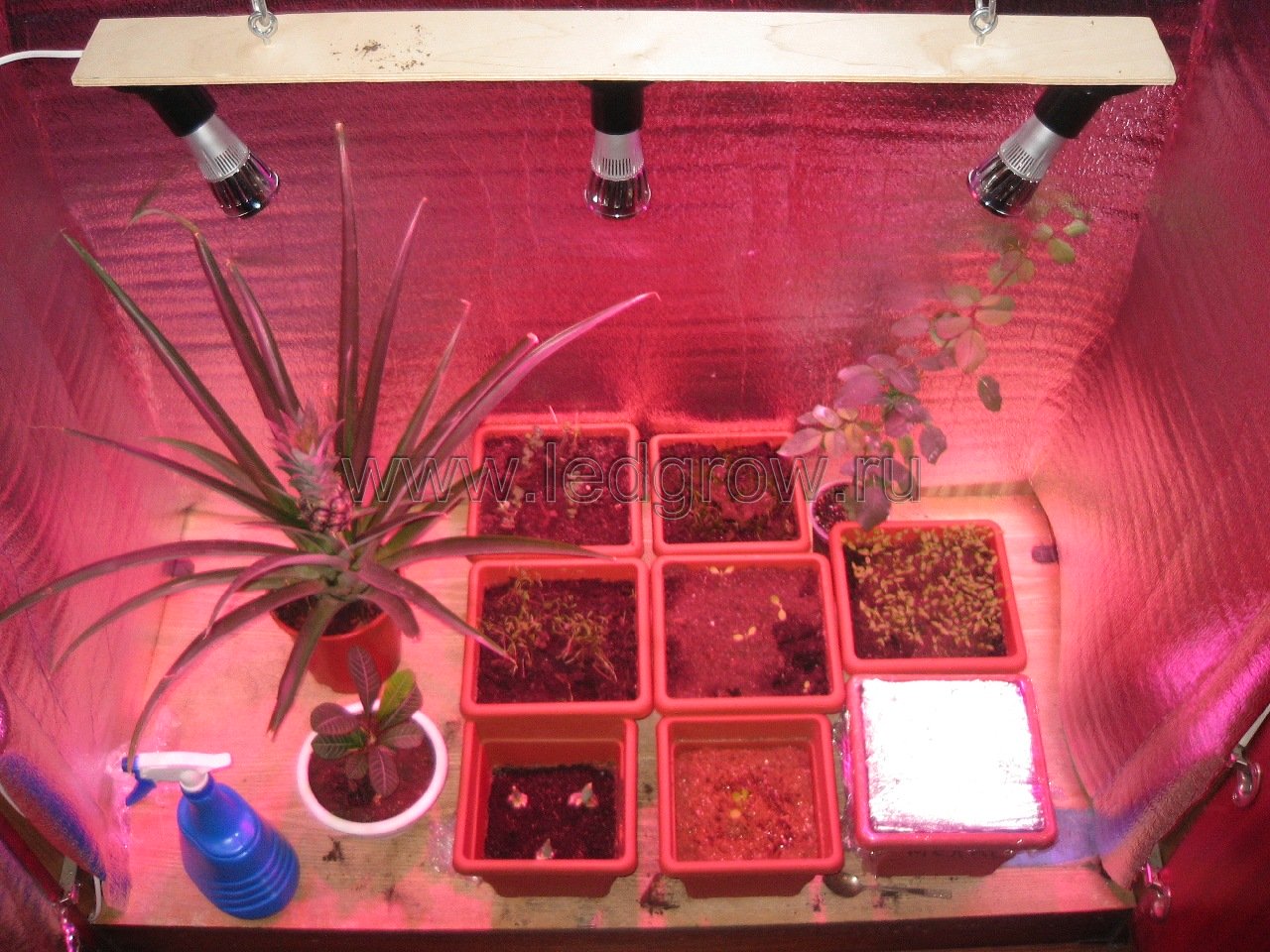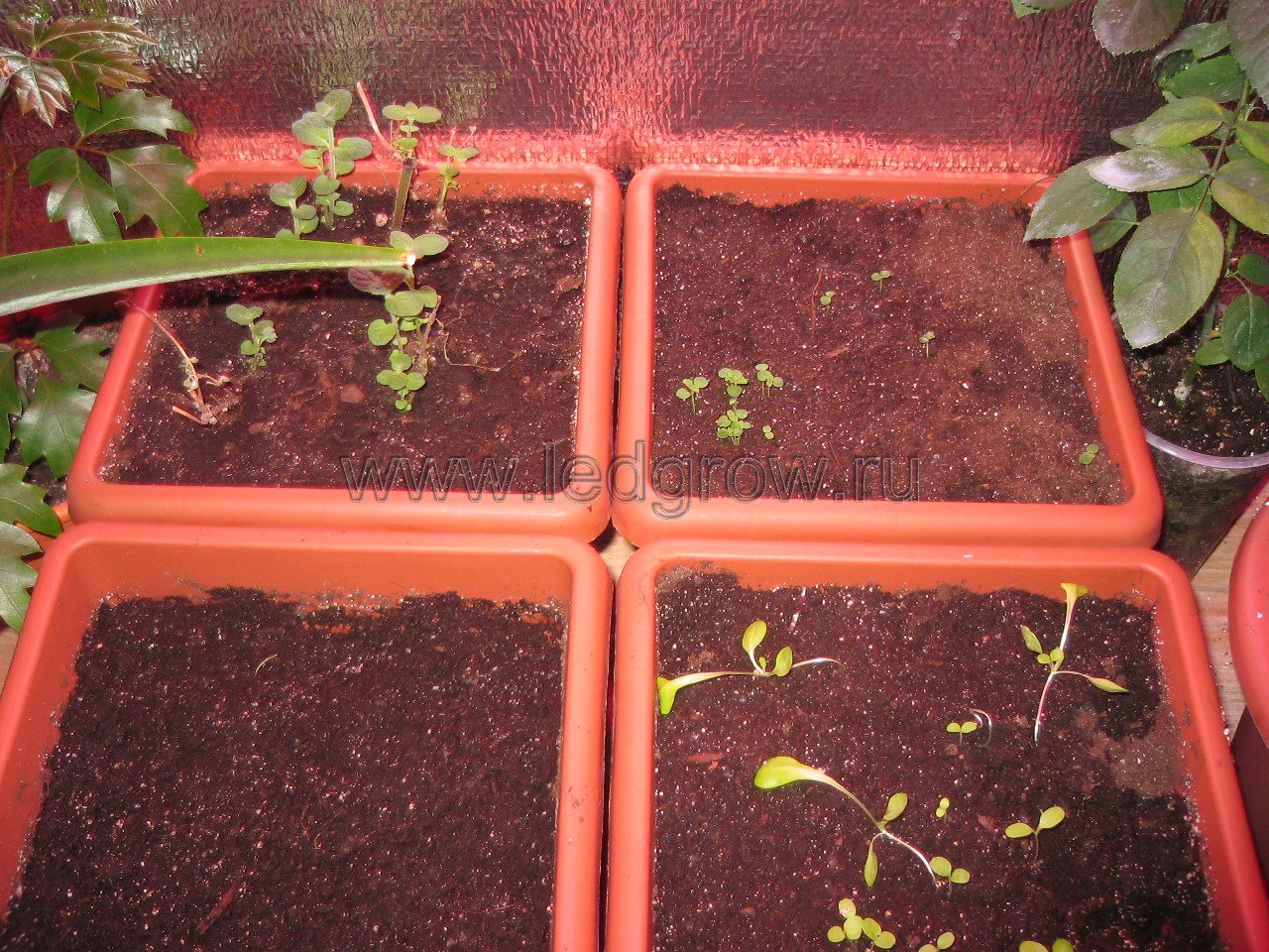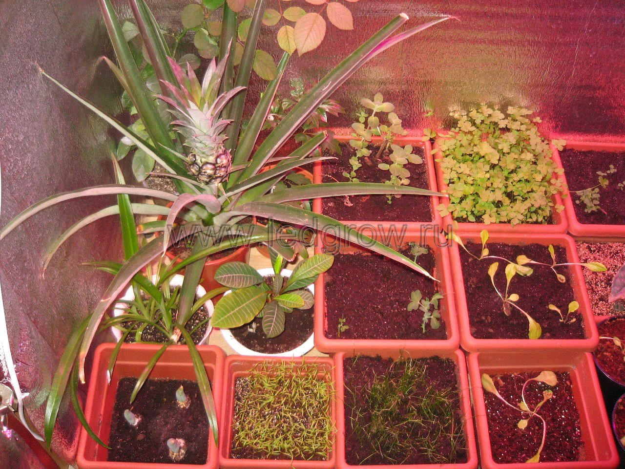 Ledgrow Опубликовано 14 марта, 2010 Жалоба Поделиться Опубликовано 14 марта, 2010 Всех приветствую в моем втором репорте посвященном светодиодам, пожалуйста отметьте для себя заранее, я ничего не продаю и ничего не навязываю мы не страдаем от недостатка клиентов, я просто показываю потенциальные возможности использования светодиодов в домашних условиях и по возможности отвечаю на возникающие вопросы, где вы будете их покупать и будете ли покупать вообще мне все равно, поэтому очень Вас прошу удержаться от нападок в мою сторону по этой теме и прежде чем что то критиковать сделайте лучше меня или хотя бы так же, заранее благодарю за понимание :) Предмет исследования. Особенности GrowSprout. Низкое энергопотребление — лампочка использует только 15 Вт. Минимальная рабочая температура — растения не пострадают даже при полном контакте с лампой. Универсальность — тип цоколя Е-27. Срок службы до 100.000 часов. Безвредный для Вас и окружающей среды. Применение GrowSprout: Дополнительное или основное освещение рассады и клонов. Основное освещение области 15×15 см. Дополнительное освещение растений совместнос металлогалойдной или натриевой лампой для увеличенияурожайности и скрости роста. Характеристики. • Освещаемая площадь до 4 кв. метров* • Тип цоколя Е-27. • Срок службы до 100.000 часов*. • Номинальное напряжение: 220-240V 50Hz. • Макс. мощность: 15W. • Световая мощность: 2250Лм. • Источник света: LED мощностью 1 Вт • Цвет: Красный & Синий (7:2) • Длина волны: Красный - 660 нм, Синий цвет - 450 нм • Рабочая температура: -20°c ~ +50°c • Угол освещения: 120 ° • Размер: 17.5×6 см • Вес: 0,25 кг *данные производителя. Условия выращивания: Шкаф платяной обыкновенный, отражающее покрытие пленэкс, дополнительная вентиляция отсутствует (естественный приток из щелей) Высота - 150 Ширина - 110 Глубина - 60 Площадь - 0.66м2 Задачи:Определить достаточно ли 45 Вт. для освещения площади в 0.66м2 и полноценного существования и развития светолюбивых растений. Цели: Обеспечить себя свежей зеленью, удовлетворить потребности светолюбивых растений в достаточном освещении в осенне-зимний период, реанимировать измученные или больные растения в случае необходимости. Цитата Ссылка на комментарий Поделиться на другие сайты Поделиться