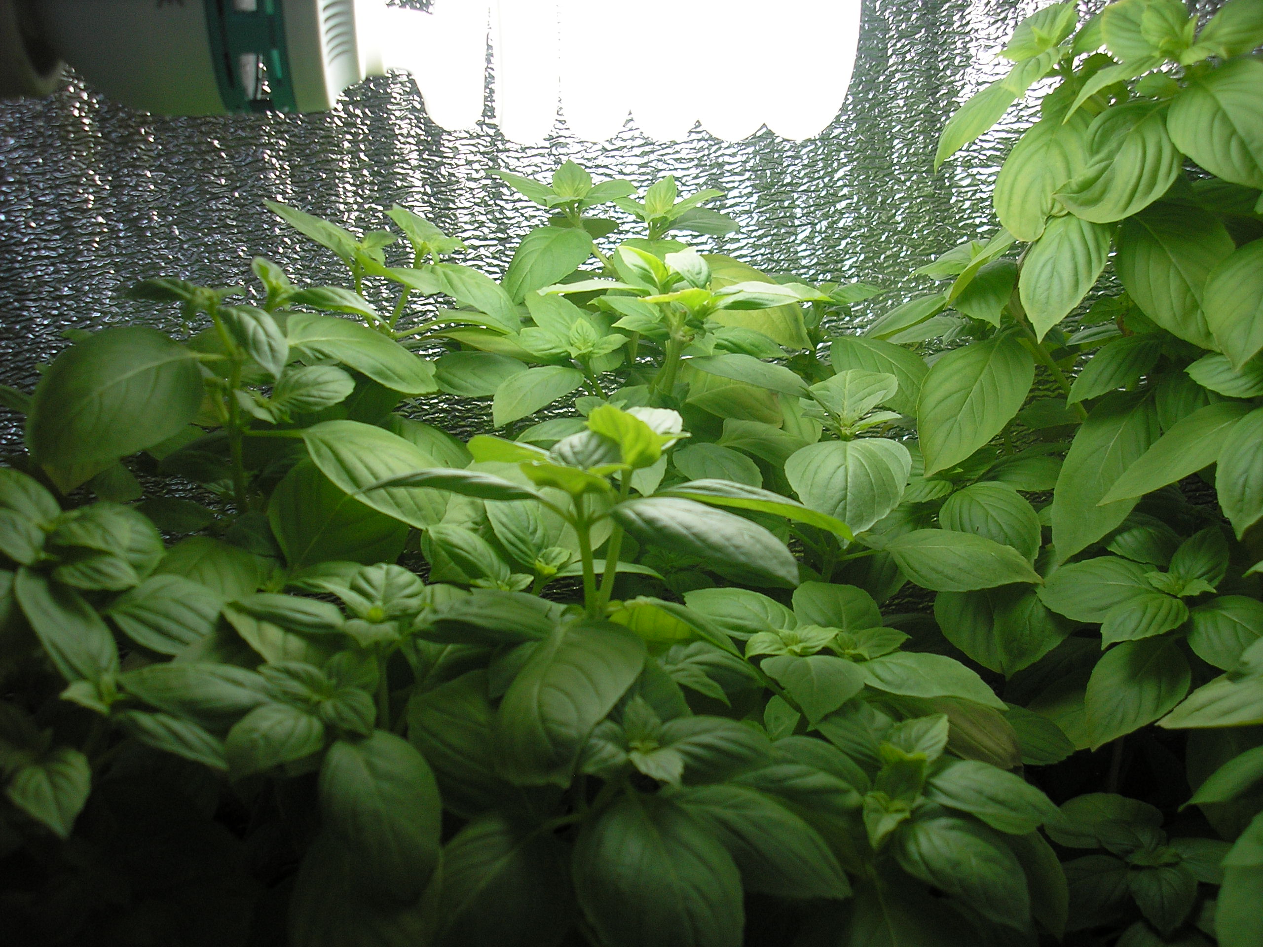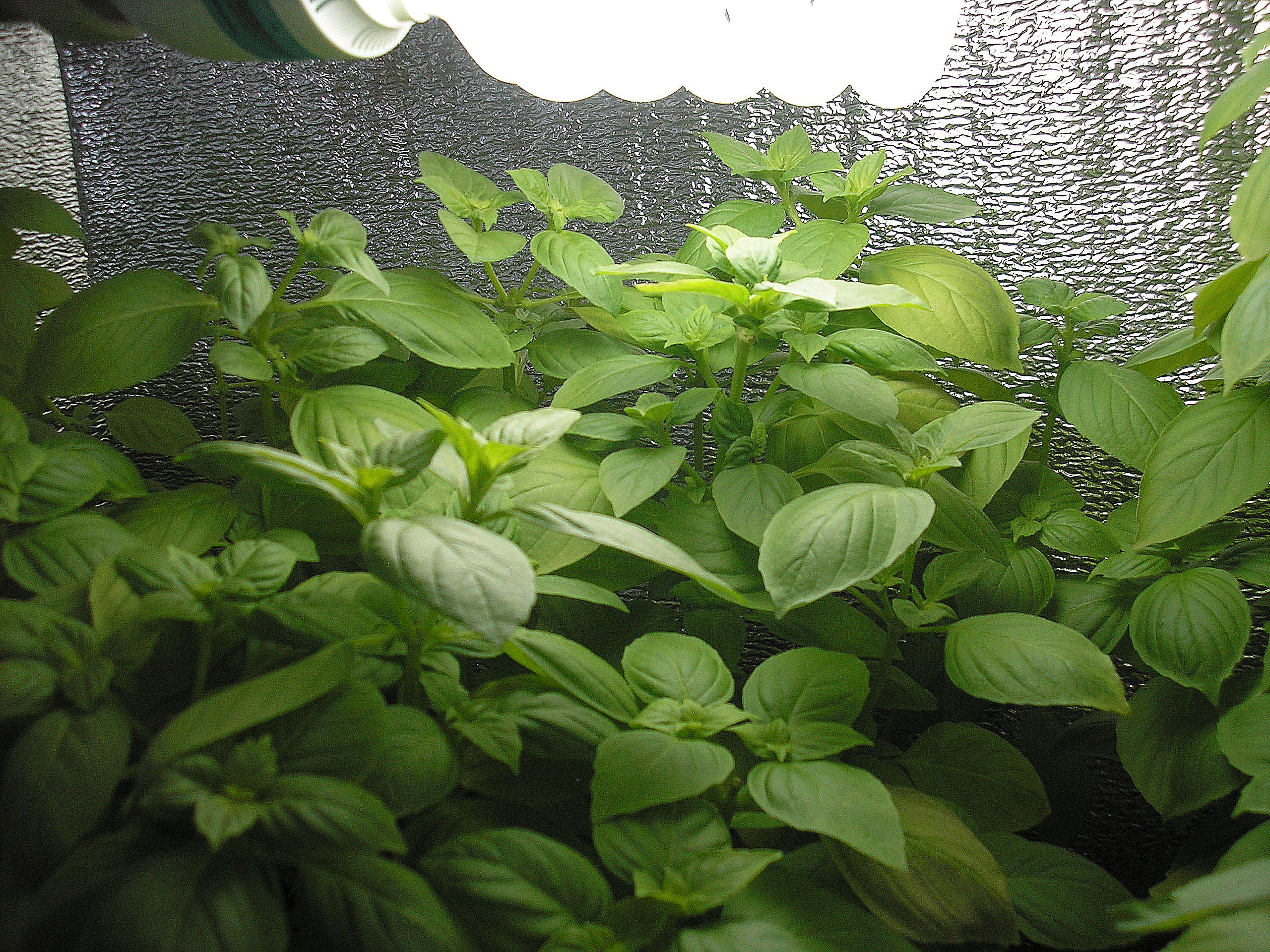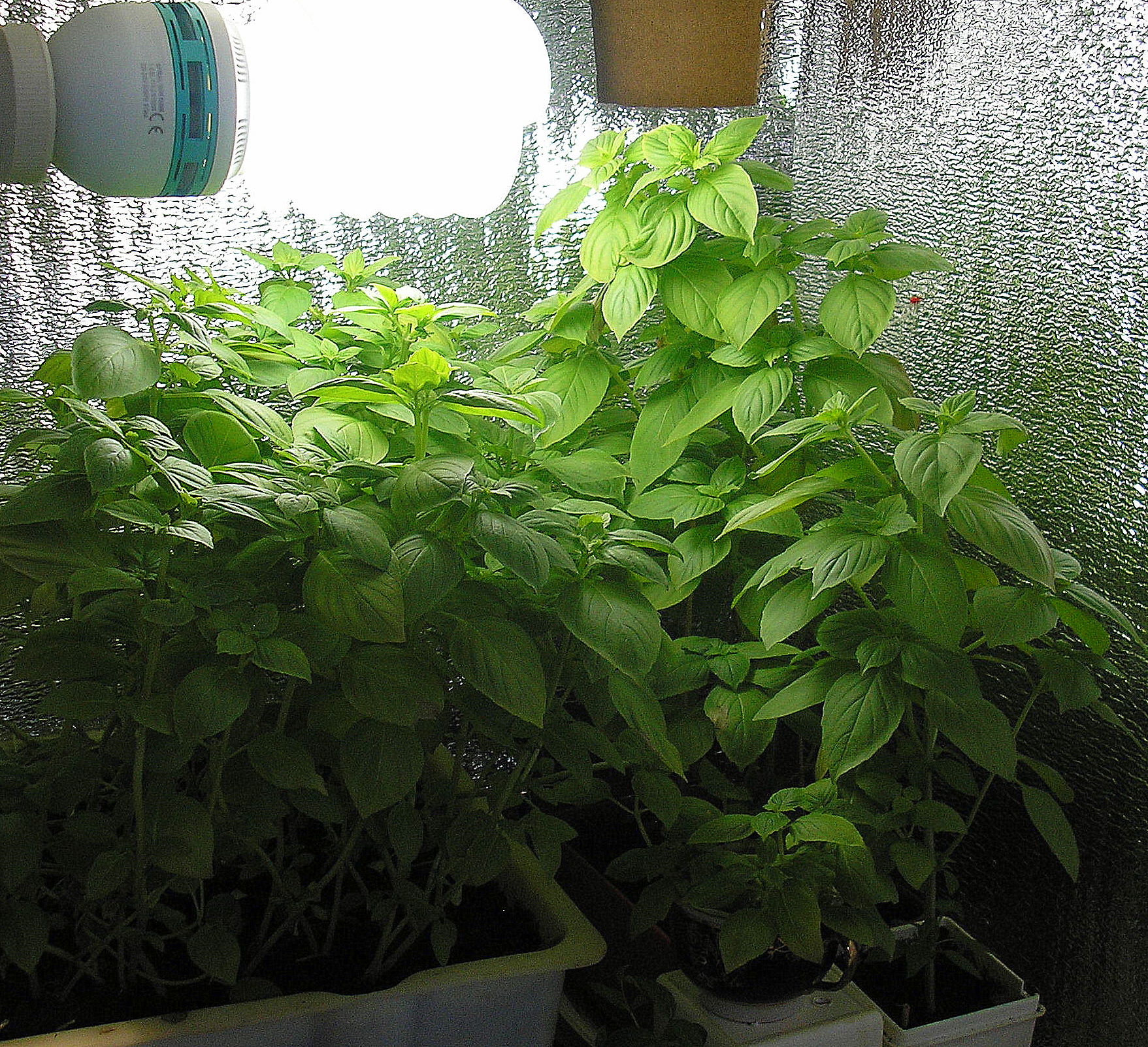 Adriano Опубликовано 8 августа, 2011 Автор Жалоба Поделиться Опубликовано 8 августа, 2011 День №14. Растениям базилика исполнилось 2 недели! После полива раствором удобрений двое суток ничем не поливал и не опрыскивал. На улице стоит жара +35С. Температура в боксе +32С. На ночь опрыскал раствором сульфата магния. На фото очень хорошо видно, что растения, которые находятся непосредственно под лампой и вправо, стали опережать те растения, которые растут за лампой, т.е. прямо под керамическим патроном и влево, к левой боковой стенке бокса. Растения, что растут у задней стенки бокса и заметно выше всех остальных - это базилик, купленный в магазине в маленьком торфяном горшочке. Поставил в бокс для реанимации. он за 4 дня полива водичкой заметно посвежел и был съеден со спагетти. 1 Цитата Ссылка на комментарий Поделиться на другие сайты Поделиться