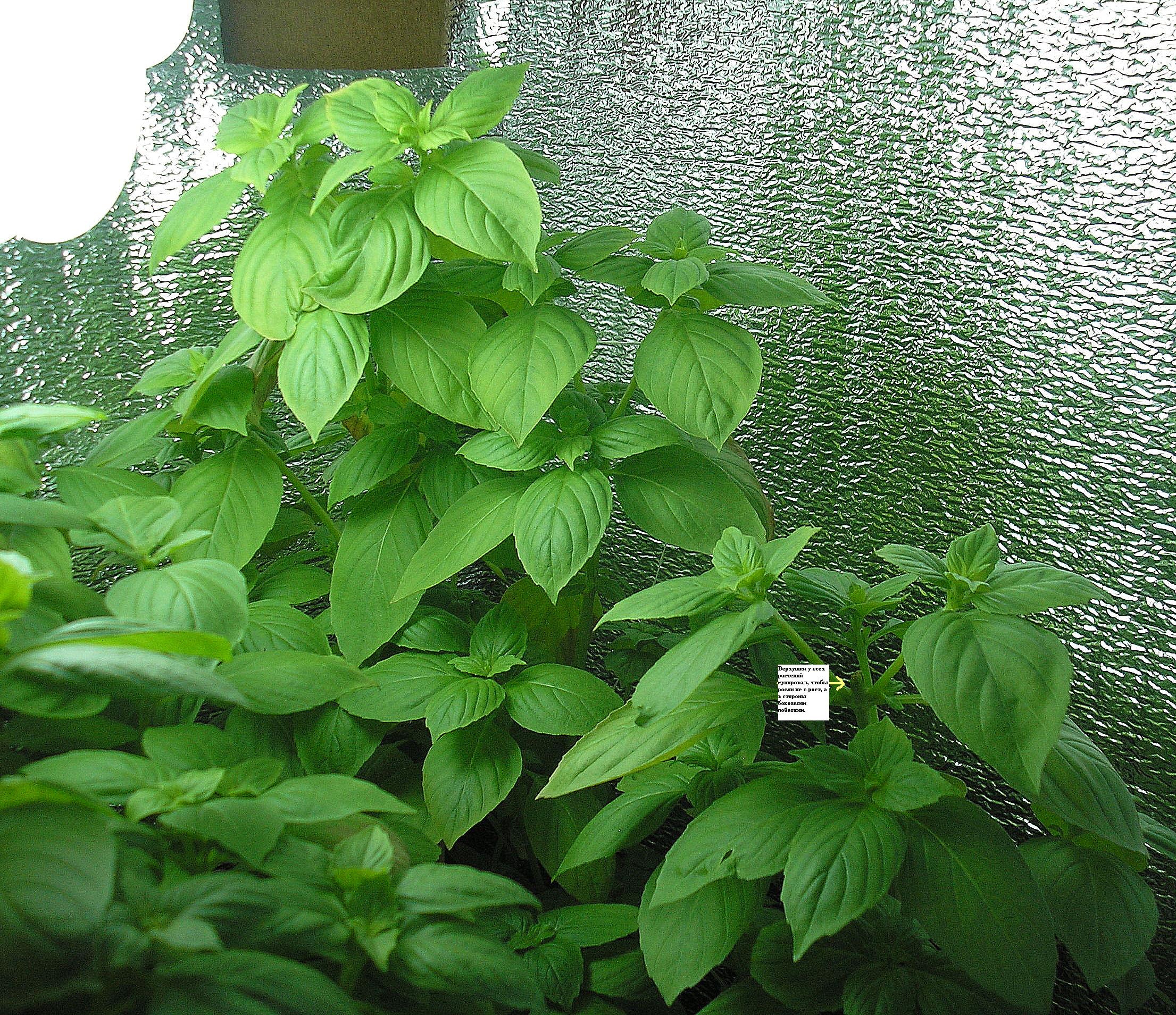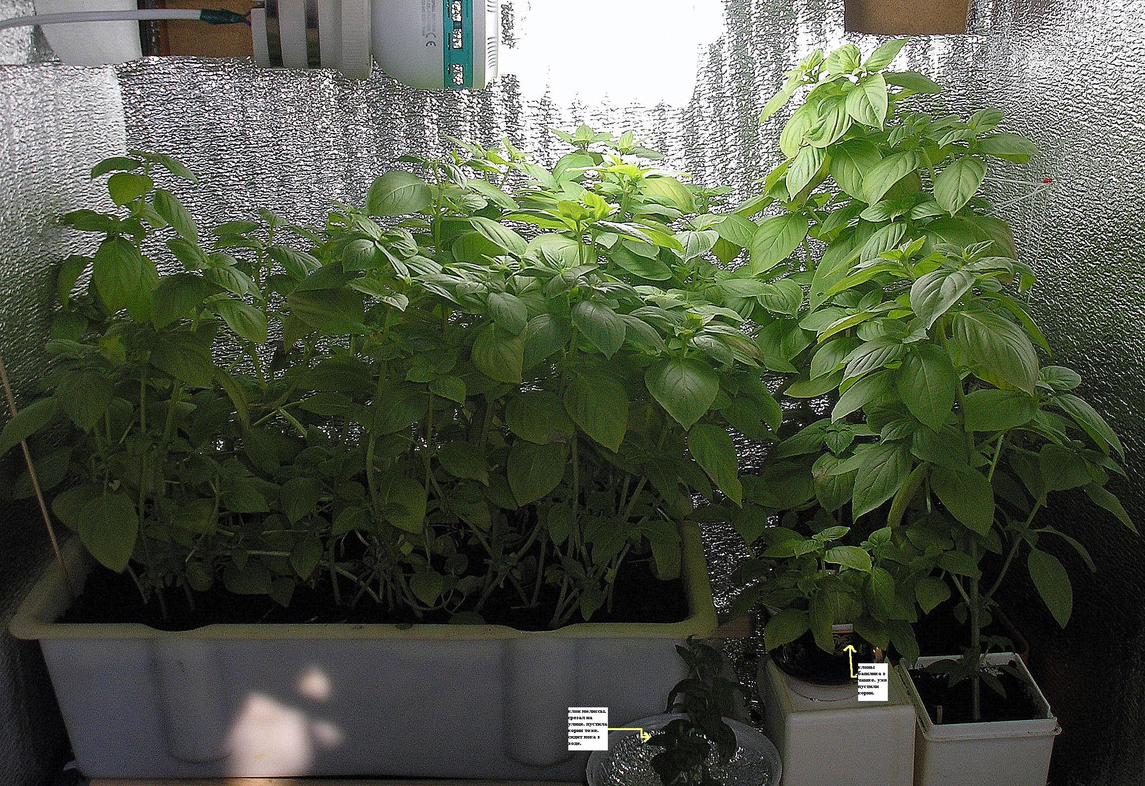 Adriano Опубликовано 9 августа, 2011 Автор Жалоба Поделиться Опубликовано 9 августа, 2011 День №30. Вот так незаметно и прошел целый месяц! Базилик под лампой максимально занял пространство. Для более интенсивного роста зеленой массы я купировал все верхушки растений и некоторые другие веточки, чтобы развивались побеги в междоузлиях. Со слабых растений я решил срезать штук 10 веточек и вырастить клоны. Так и сделал. Начикал все как нужно и поставил в чашку с раствором сульфата магния. Еще дома пили коктейль Мохито и осталось пару веточек мяты. Так я одну взял и тоже сунул в отдельный стакан, чтоб пустила корни. Впервые решил полить растения компотом 100% концентрации, чтоб растения сил после подрезки набрались. Все, что срезал-съели! Этот сорт базилика в сравнении с магазинским покупным базиликом очень выигрывает. Эфирных масел на порядок больше, сильно пахнет, вкус очень насыщенный. Цитата Ссылка на комментарий Поделиться на другие сайты Поделиться