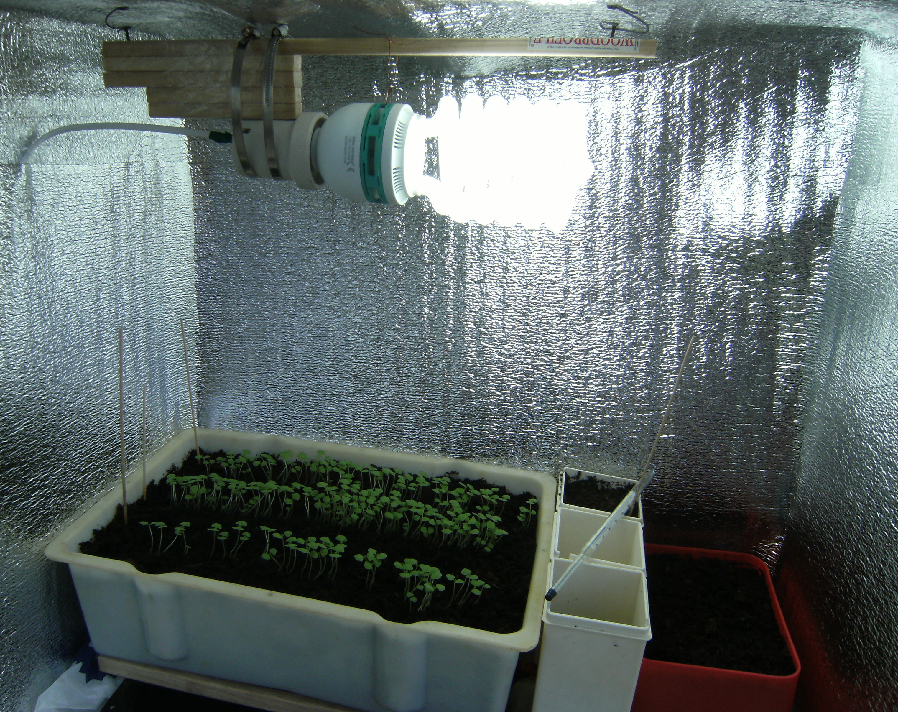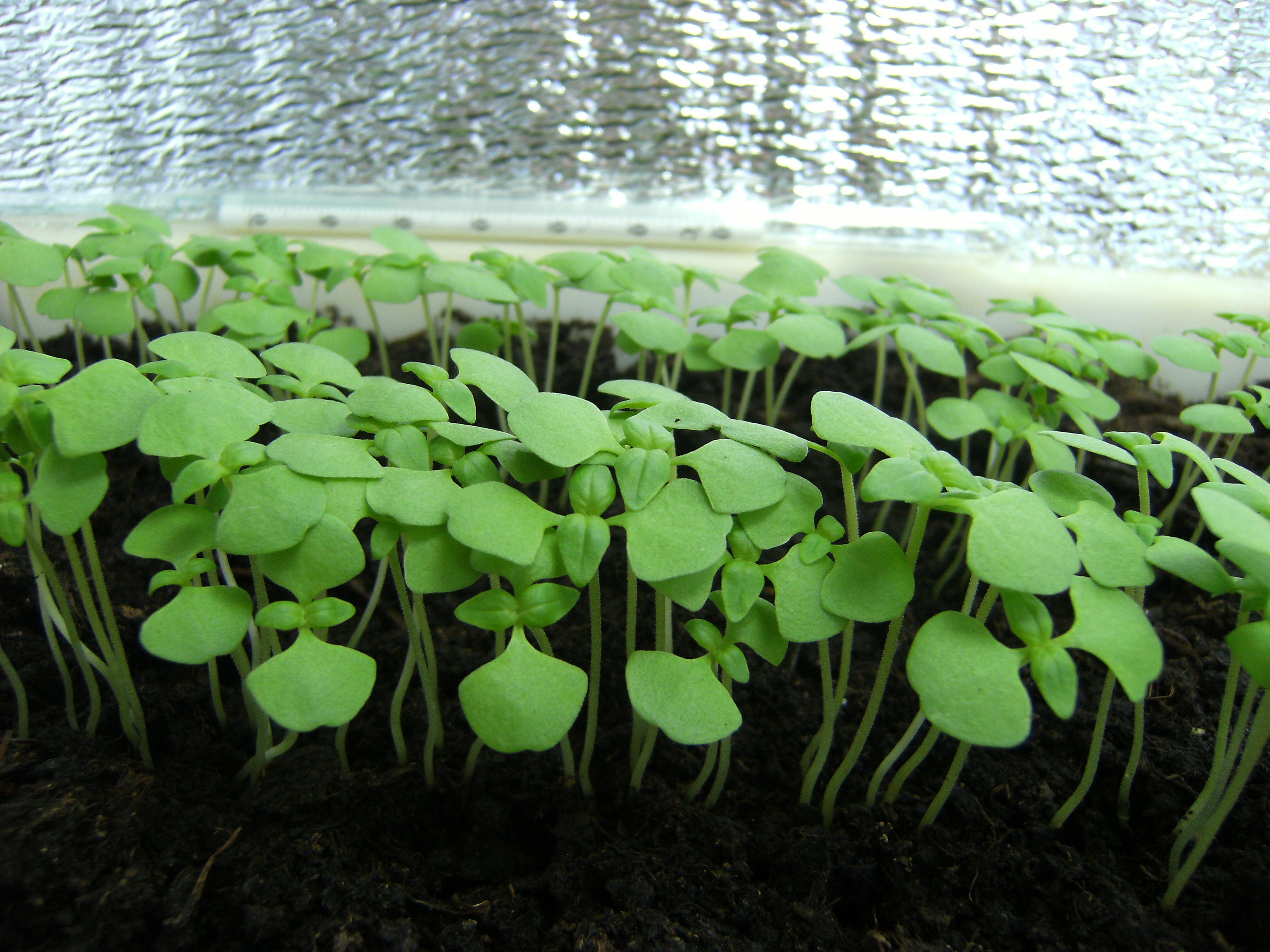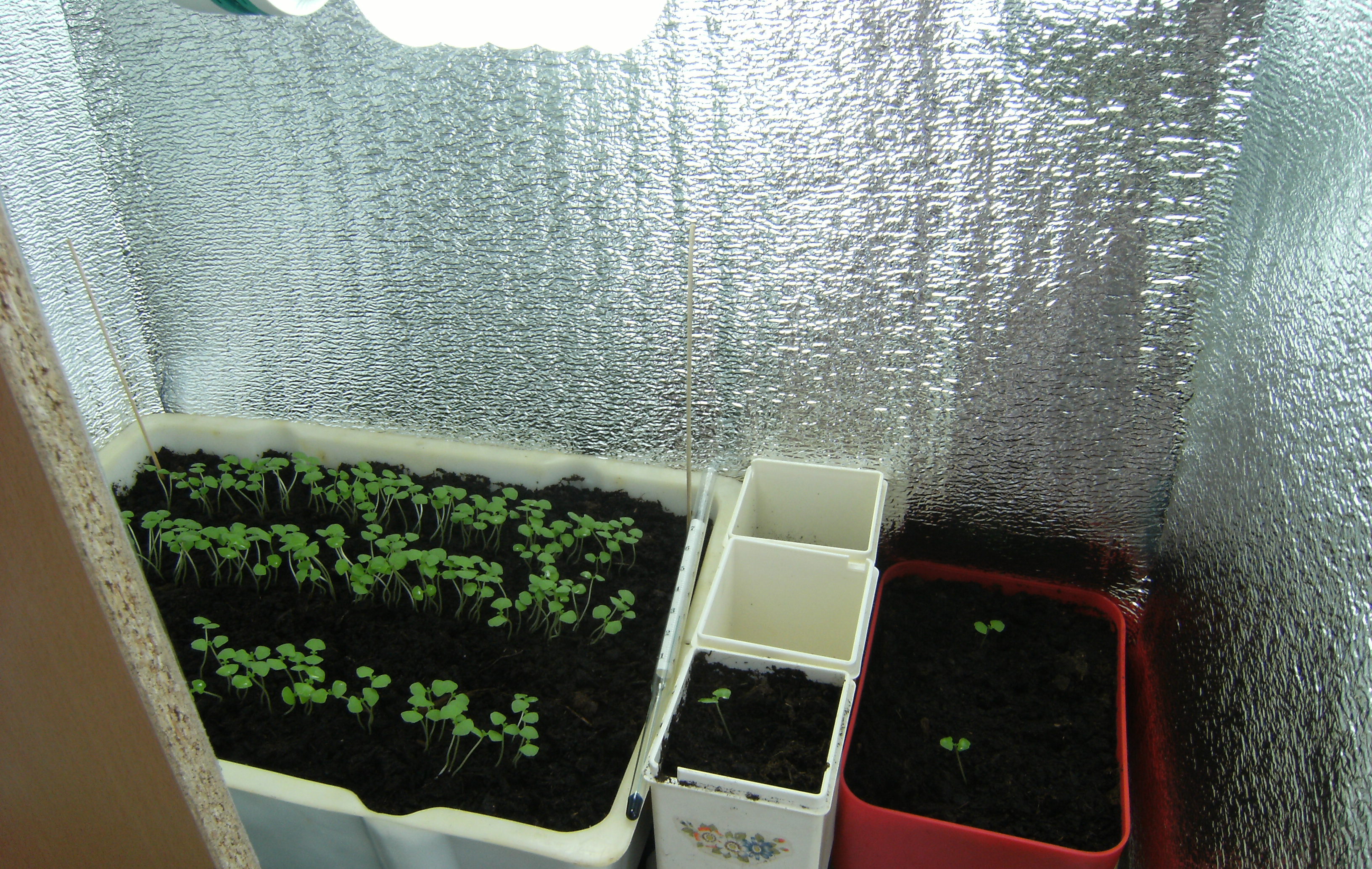 Adriano Опубликовано 8 августа, 2011 Автор Жалоба Поделиться Опубликовано 8 августа, 2011 (изменено) Начну отсчет жизни базилика с дня массовых всходов. И так. День №3. Утром температура на грунте в ящике +23С. Опрыскал раствором сульфата магния концентрацией 1мл/1л воды. День №4. Утром обнаружил малюсенькие зародыши новой пары листьев. Подготовил два небольших ящика-горшка для последующей пересадки в них базилика при прореживании. А то всходы очень густые, так как сдуру посеял всю пачку семян. Можно было так не делать. Ну, это и есть первый опыт агрономства, чтобы потом все проанализировать и исправить ошибки в будущем! В это же время я уже подготовил место для гроубокса, нашел в гараже от старой кухни кухонный разобранный шкаф, купил лампу ЭСЛ 105 W 6500 К, таймер, пенофол, провода. Изменено 8 августа, 2011 пользователем Adriano Цитата Ссылка на комментарий Поделиться на другие сайты Поделиться
