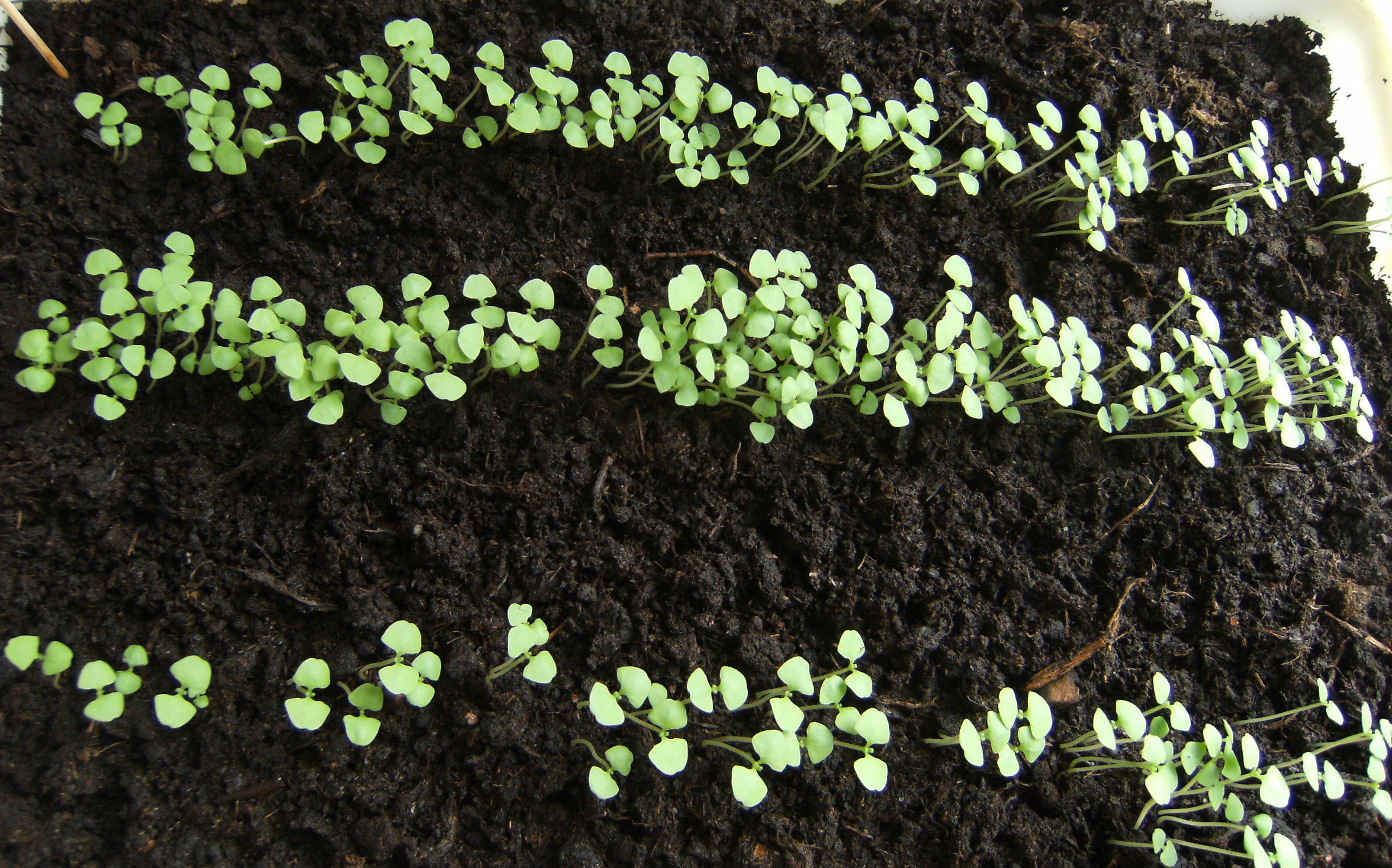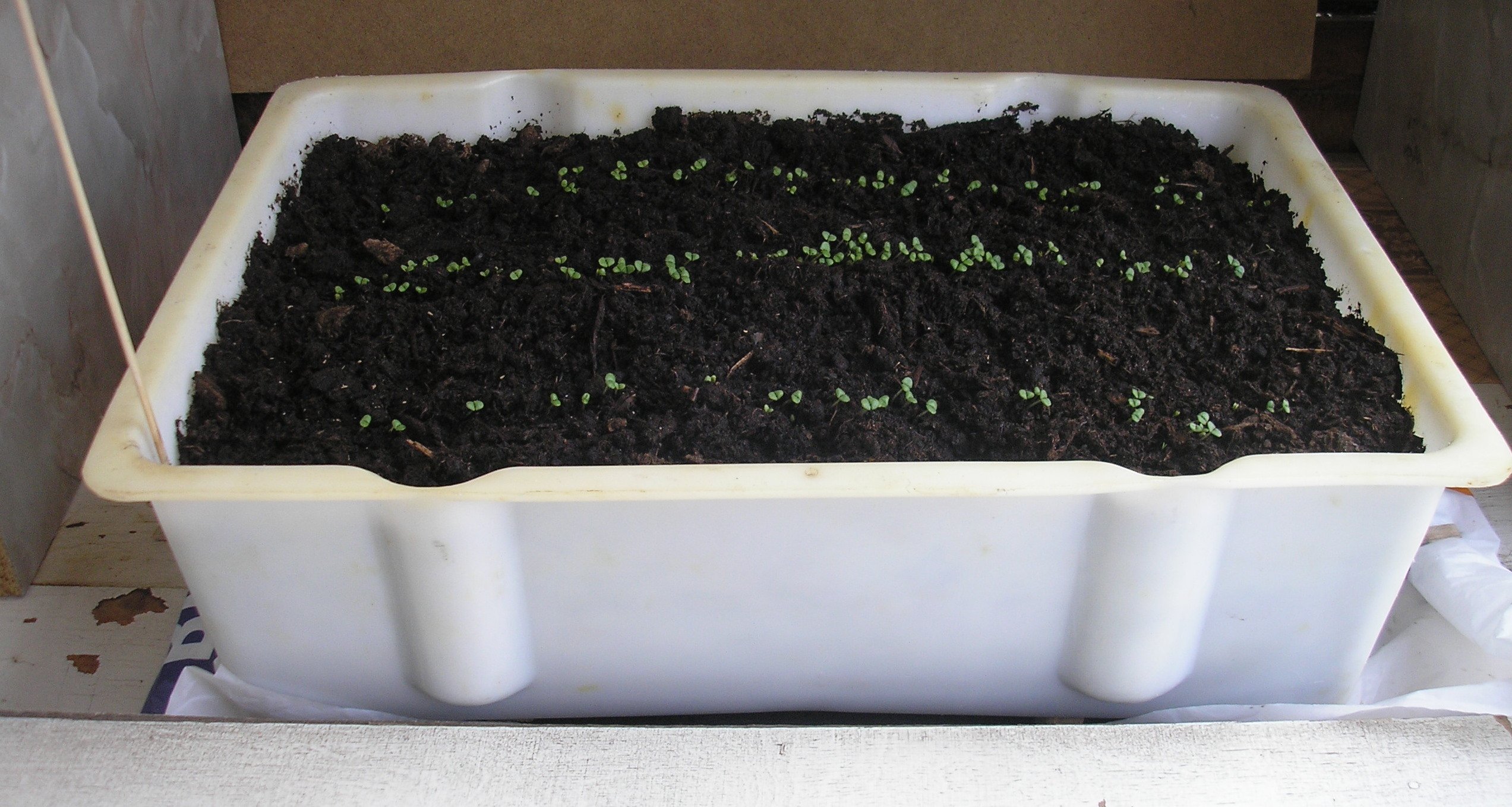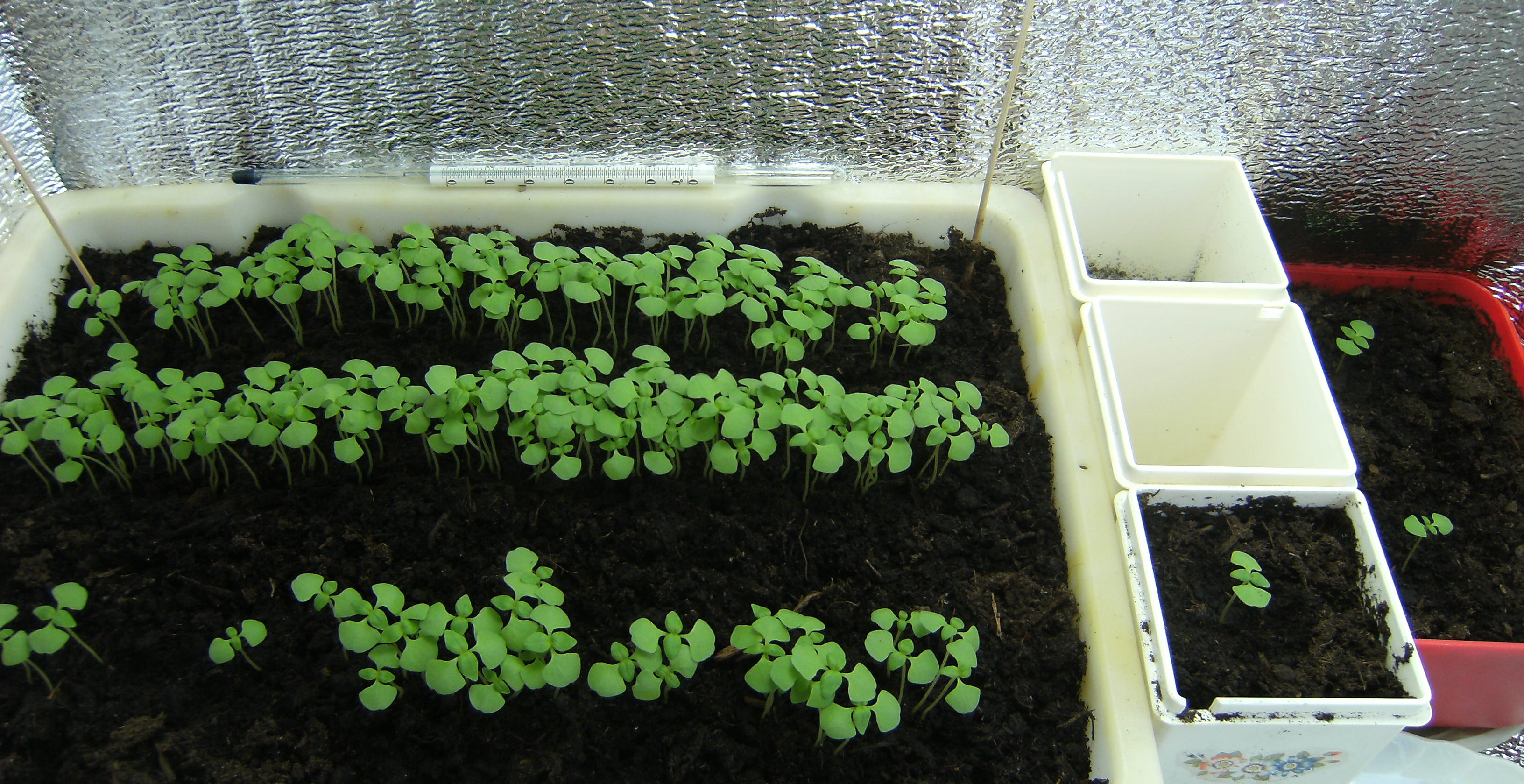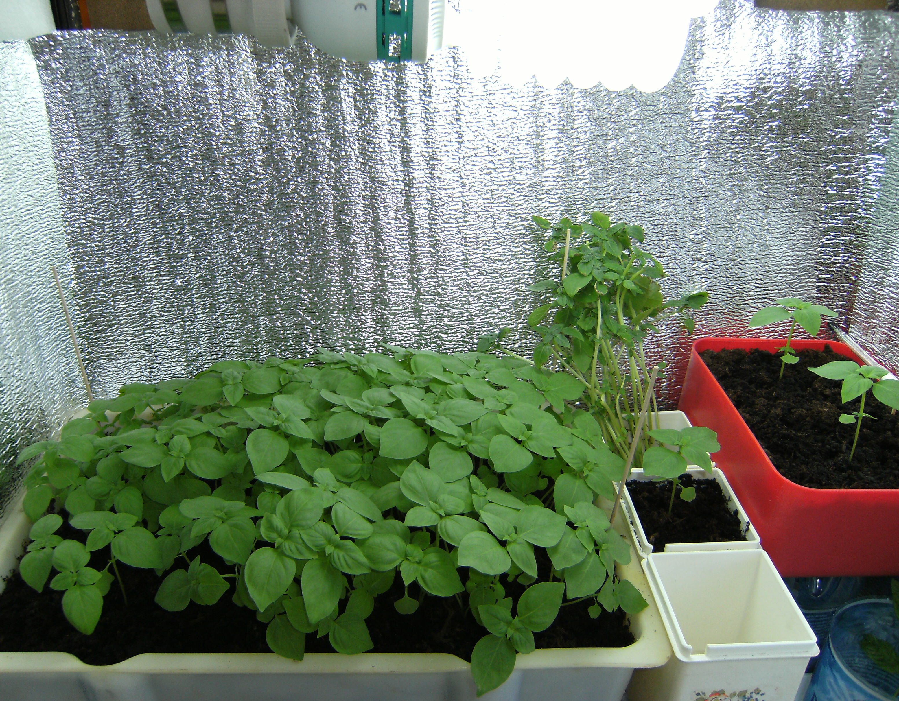 Adriano Опубликовано 8 августа, 2011 Автор Жалоба Поделиться Опубликовано 8 августа, 2011 (изменено) Начну отсчет жизни базилика с дня массовых всходов. И так. День №3. Утром температура на грунте в ящике +23С. Опрыскал раствором сульфата магния концентрацией 1мл/1л воды. День №4. Утром обнаружил малюсенькие зародыши новой пары листьев. Подготовил два небольших ящика-горшка для последующей пересадки в них базилика при прореживании. А то всходы очень густые, так как сдуру посеял всю пачку семян. Можно было так не делать. Ну, это и есть первый опыт агрономства, чтобы потом все проанализировать и исправить ошибки в будущем! В это же время я уже подготовил место для гроубокса, нашел в гараже от старой кухни кухонный разобранный шкаф, купил лампу ЭСЛ 105 W 6500 К, таймер, пенофол, провода. Изменено 8 августа, 2011 пользователем Adriano Цитата Ссылка на комментарий Поделиться на другие сайты Поделиться
