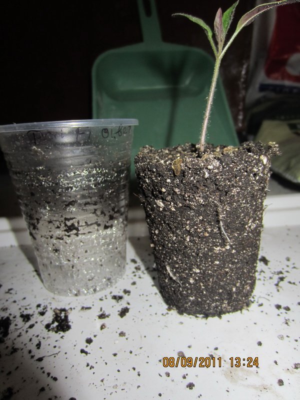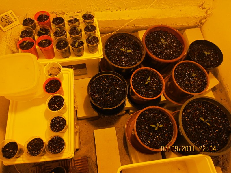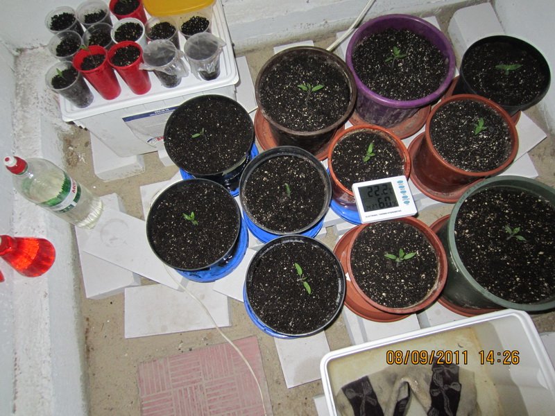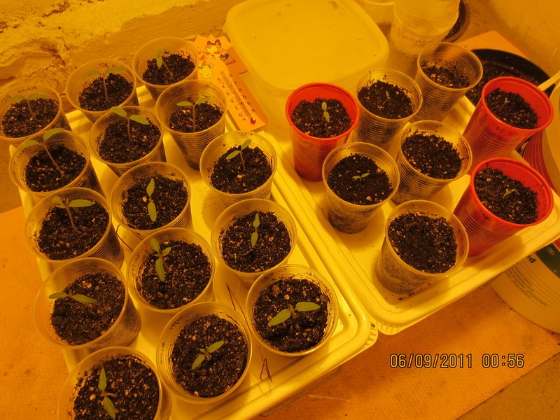 Clin Опубликовано 5 сентября, 2011 Жалоба Поделиться Опубликовано 5 сентября, 2011 Привет . Пробую вырастить помидорки и перцы. Место их обитания Бокс 2,0/1,3/1,0, дляних работает Днат 400 Philips. Собрать все это было не просто, даже спомощью . Также вентиляция на данной стадии: - 1 вход -пасивный, -2 вытяжка - от Вентс 101м.куб./ч... я подозреваю что этого маловато. - хотя бокс и есть подвал. Темпа "днем" - 28-29, "ночью" -24-25. - ночью вытяжка не работает и на нюх мне уже кажеться, что кислорода не хватает, а также влажность повышаеться, но это на глаз---- завтра по плану приедет моя мини- метео станция и мы выясним поточнее об этом. Пытаюсь вырастиьть такие сорта от банка Биония: -перцы: - Украинский горький, - Фехер. - (также заказал самоопыляющиеся гибриды Гкркулес F1 и Джемини F1) -томаты: - Санька, - Черри, - Эфемер, - самоопыляющиеся гибриды : - Толстой F1 и Тести F1. Семена были замочены и засажены тремя способами: 1 - по методу от LEZVIE81 берём 2 пластиковых стакана , сыпем земли (поливаем), слегка тромбуем(снова поливаем) , сверху тонкий слой песка (не поливаем) , потом мелкого вермикулита (пыль !!!не поливаем) , а уже потоооом сыпем семена поверху и никакого закапывания ! накрываем вторым стаканом , склеиваем их между собой скотчем и под свет яркий ... семена эти от света гораздо быстрее прорастают (перед этим их ещё нужно в холодильнике сутки держать) . правда перлит плохо раскрошил. но метод ниче . 2 - 1/2 стакана грунта, притрамбовываем плотней , поливаем обильно и опять доверху грунта и притрамбовываем легонько. потом семки закапывем на глубинеу 1,5 см. и слегка поливаем. (очень не доволен таким методом, так были посажены только гибридные томаты). 3 - по методу №2 только, посажены были, проросшие семки, с ростками не менее размера семки, в контейнерах пищевых на влажной салфетке в боксе. Я получил одинаково всходов со способом №1. Земля для рассады - такая была + перлит = 80%/20% . 1 Цитата Ссылка на комментарий Поделиться на другие сайты Поделиться