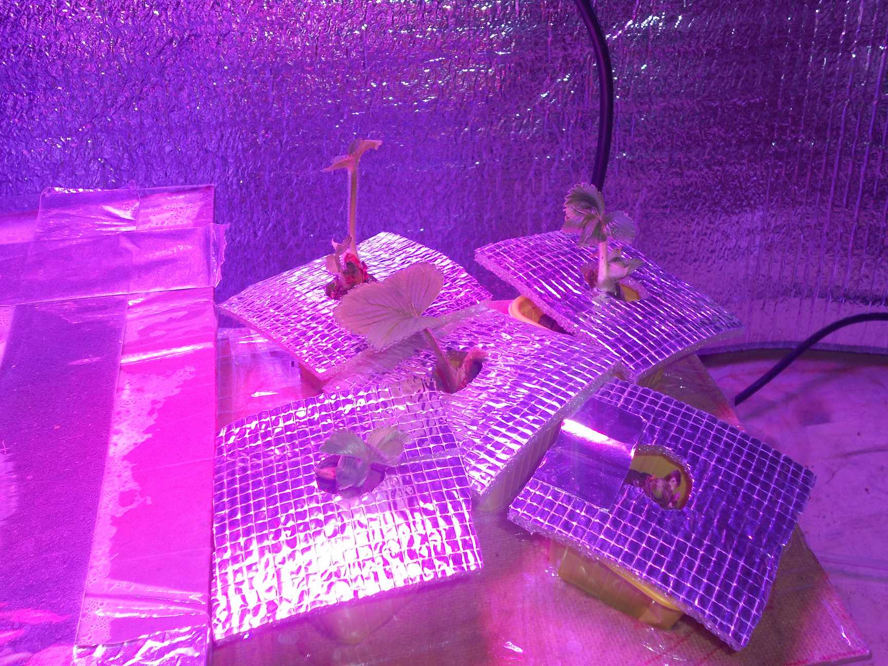sfoddler Опубликовано 25 апреля, 2012 Автор Жалоба Поделиться Опубликовано 25 апреля, 2012 Земляника 19 дней Свет: 18/6. 2 ДНаЗ 400 + LED 180. Достал люксометр, давно хотел сравнить ЛЕД и ДНаТ. LED - 20 см. - 50000 Lm, ДНаЗ 400 40 см. - 30000-55000 Lm. У ДНаЗа измерял свет около растишек, поэтому такой разброс, некоторые стоят прям под лампой, некоторые немного сбоку. В общем ЛЕД я доволен, хорошо светит, еще бы шумела потише. Конечно измерения ЛЕД не совсем точные, т.к. ДНаЗ тоже светит рядом и от него свет так же считается. Температура/влажность: День: 32 С, Ночь: 25 С/60% Раствор: 100%, ТДС - 870 ппм, пш - 6,0. Сменил полностью раствор. Растишки переехали в ведро, где раньше жил цветок. Теперь рабочий объем раствора 10л вместо 3л. Всем Мир Цитата Ссылка на комментарий Поделиться на другие сайты Поделиться