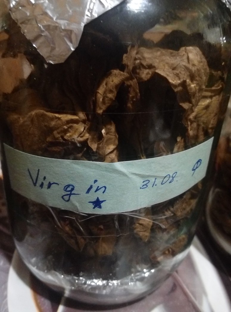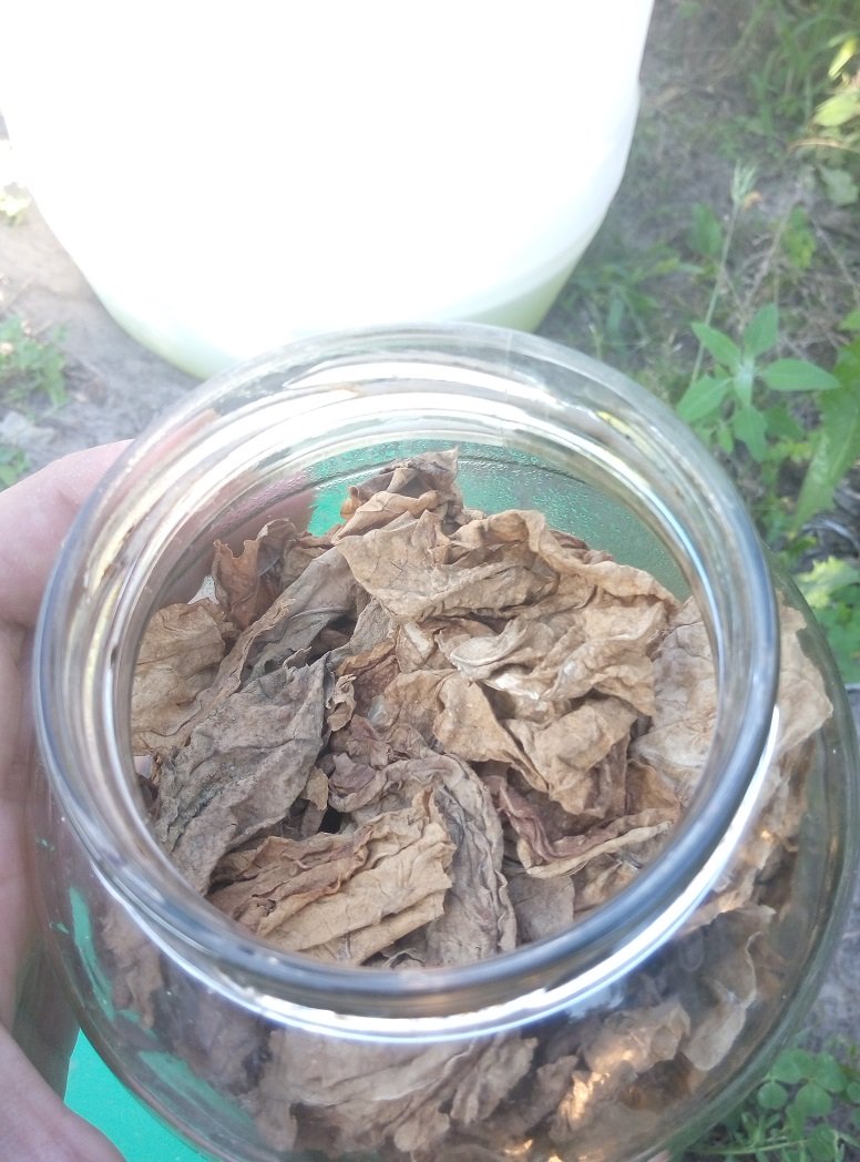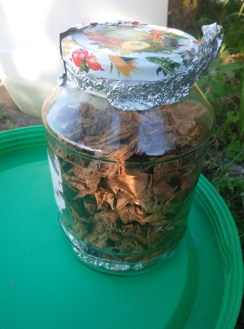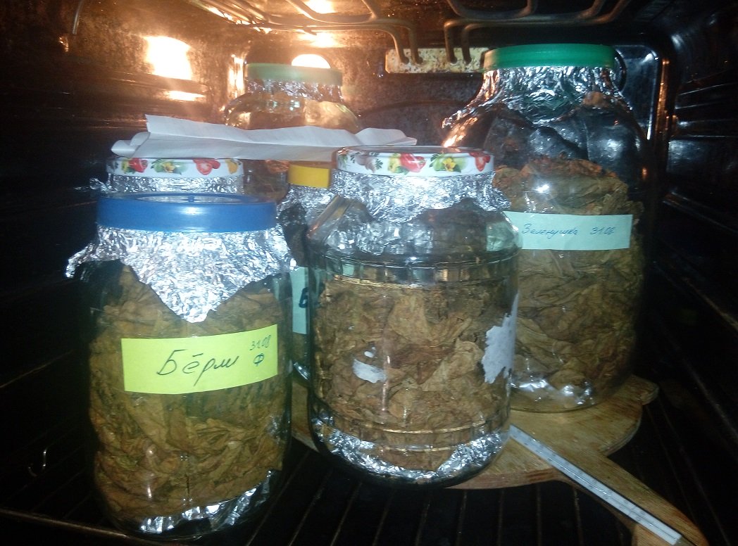 В жаркий день когда +35, внутри бочки более 50, так что ставлю ее в притененное место. Листья предварительно полностью просушил, увлажнил, убрал центральную жилку. На дне банки фольга, со стенок под нее собирается конденсат, но лист остается сухой. Этот табак в банке ферментировался 7 дней, его влажность небольшая, может 10-15%, он похрустывает, измельчается и куриться нормально. Но это не предел, попробовал и поставил дальше ферментироватся, еще недельки 2-3.
