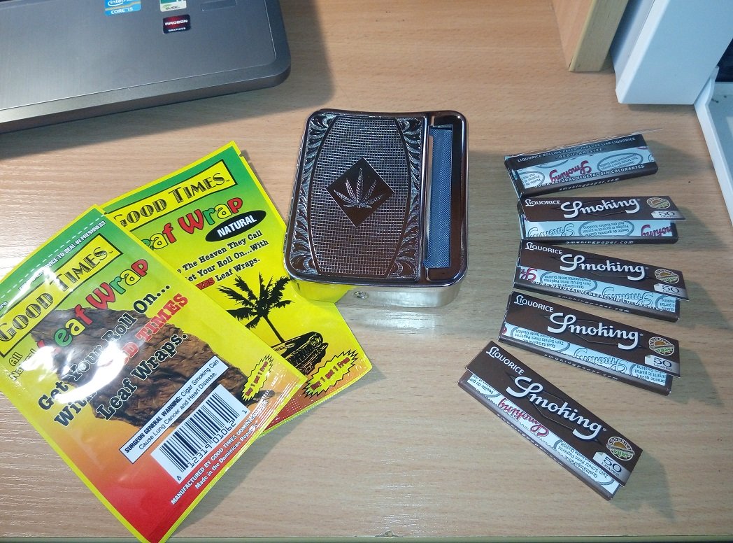 Крутилка папирос+портсигар, лакричные(ммм) бумажки для самокруток, и пару табачных листов для кручения сигарилл(из Доминиканы). Щастью нет предела, еще бы лапшерезку с мелким шагом достать.