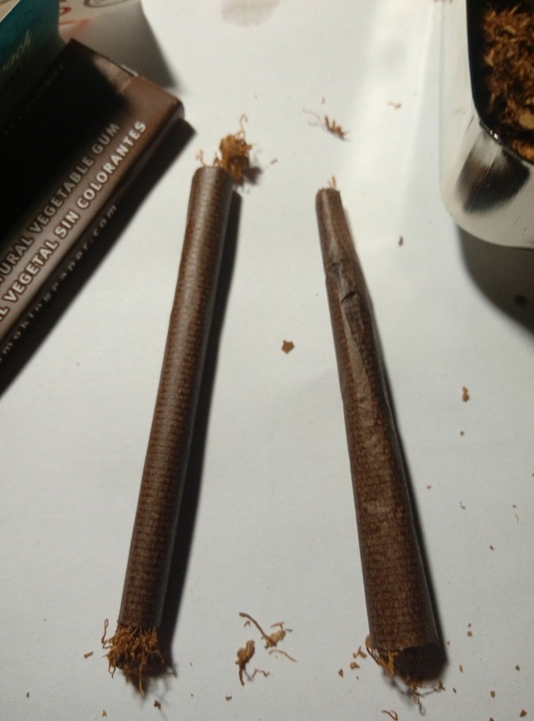 На фотке две сиги, слева ровная это машинкой, справа ручной сборки) Табак в банке ароматизирую грушей и экстрактом апельсина(на дне банки в ватных дисках). Друг подогнал заморского табака, но он пересох и я решил его увлажнить таким образом. Через 2 дня табак имел чудесный запах, нужную влажность и скурился оч оч быстро))
