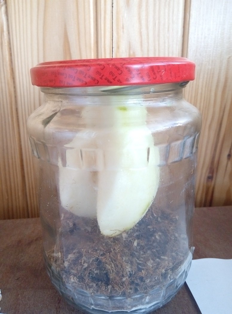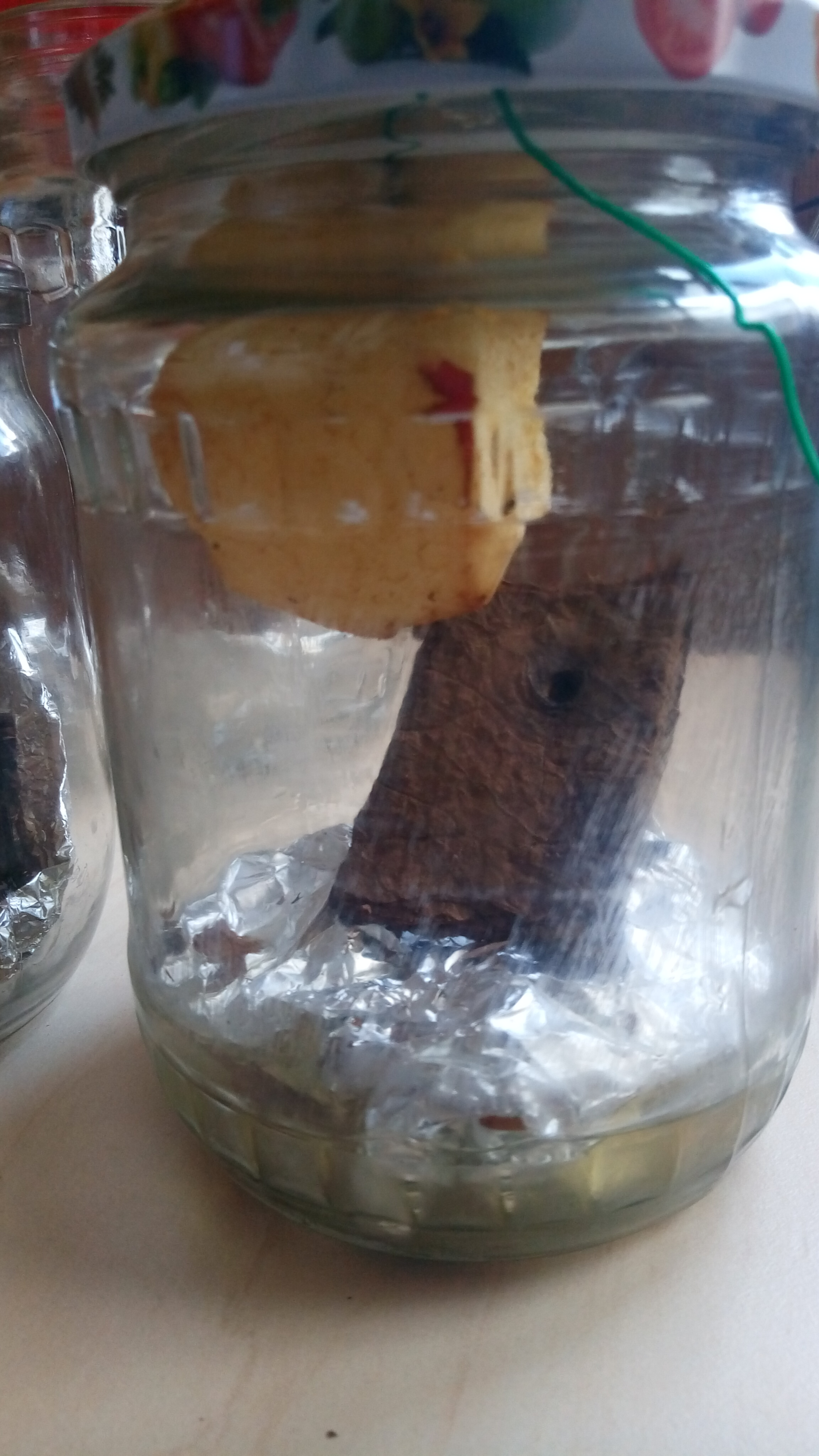 4. Сверху крепим очищеный от шкурки фрукт (яблоко, груша). Проволокой можно, или через отверстие в крышке